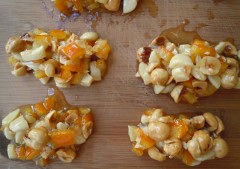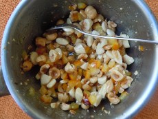 Mieszamy, doprowadzamy do wrzenia. Dodajemy pokrojone na kawalki orzechy, migdaly i polewamy 3 lyzkami miodu.