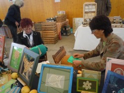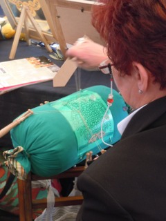 Zaproszono rowniez panie ze Stowarzyszenia zajmujacego sie sztuka „szydelkowania” specjalnymi „patyczkami”. Po wlosku nazywa sie to tombolo, slowo oznacza walek, odnosi sie do poduszki na ktorej sie „szydelkuje”.Polega to na przekladaniu na przemian 6 patyczkow z nawleczona nitka, zawsze po 2 razem. Do zajmowania sie tego typu robotkami potrzeba mnostwo cierpliwosci, a przede wszystkim wolnego czasu. Niestety nie dla mnie. Oto kilka zdjec: