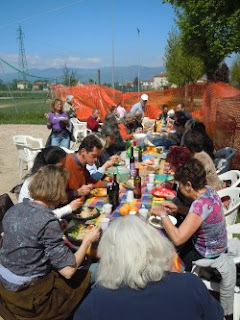 W przerwie obiadowej wszyscy targowicze zebrali sie przy jednym biesiadnym stole. Wygladalo to jak na filmach przedstawiajacych wspolne jedzenie we Wloszech.