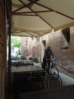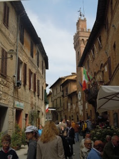 Potem jednak niebo pokrylo sie czarymi chmurami. Nagle zaczelo padac i walic piorunami. Prawie cale poludnie padalo. Szkoda, bo turysci uciekali do aut i wracali do domow. Przeczekalismy brzydka pogode. Okolo 17 wreszcie sie rozpogodzilo. Na spacer udali sie mieszkancy Buonconvento oraz nieliczli turysci, ktorzy skryli sie w barach i restauracjach.