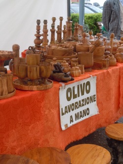 Na targu rekodzielniczym w Buonconvento poznalam bardzo milego pana. Nazywa sie Enzo Apolli, ma 71 lat. Mieszka w miasteczku o nazwie Camucia di Cortona (prowincja Arezzo). Jego pasja jest tworzenie roznych przedmiotow z drzewa oliwnego.