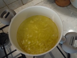Podsmazamy do momentu kiedy cebula sie zarumieni. Dodajemy soli. Wrzucamy bulion i gotujemy na wolnym ogniu przez 30-40 minut.