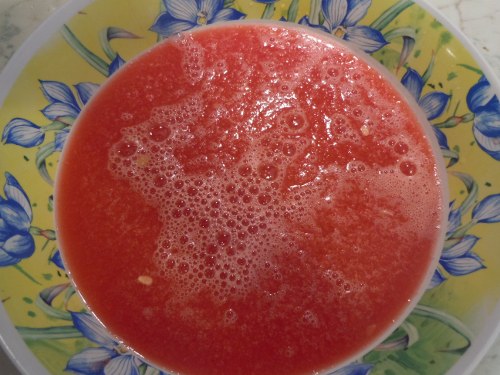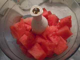 Arbuza kroimy na kawalki. Wkladamy do robota kuchennego i miskujemy wraz z sokiem z cytryny i pocukrzona woda.
