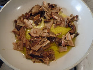 Na patelnie wlewamy oliwe i podsmazamy prawdziwki (jesli swieze to musimy je oczyscic z ziemi, dokladnie umyc i pokroic na cienkie plasterki; jesli suszone to najpierw musimy je moczyc kilka godzin w zimnej wodzie, nastepnie pokroic na drobne kawalki).