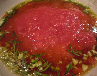Kiedy czosnek zacznie „skwierczec” dodajemy przecier pomidorowy. Dusimy wszystko na wolnym ogniu przez 20 minut.
