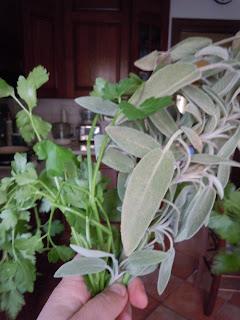 Kilka dni temu zamaszyscie zapukala do mnie sasiadka z gory. Zapytala, czy w te mrozy wychodze z domu, bo potrzebuje pilnie mnostwo szalwii oraz natki pietruszki. Zaciekawiona spytalam o przyczyne. Okazalo sie, ze z szalwii oraz rozmarynu (natka pietruszki sluzy jeszcze do czegos innego) mozna zrobic swietna przyprawe do mies i ryb.