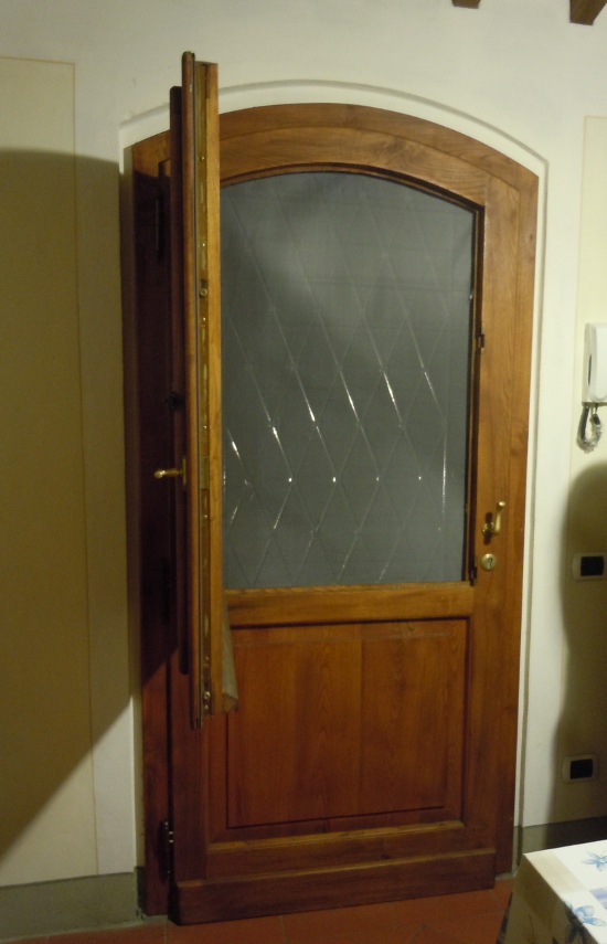 W apartamencie Tosca zwracam rowniez uwage na glowne drzwi. W cieple dni mozna otwierac ich gorna czesc. W oknie drzwi zainstalowana jest siatka przeciw komarom.
