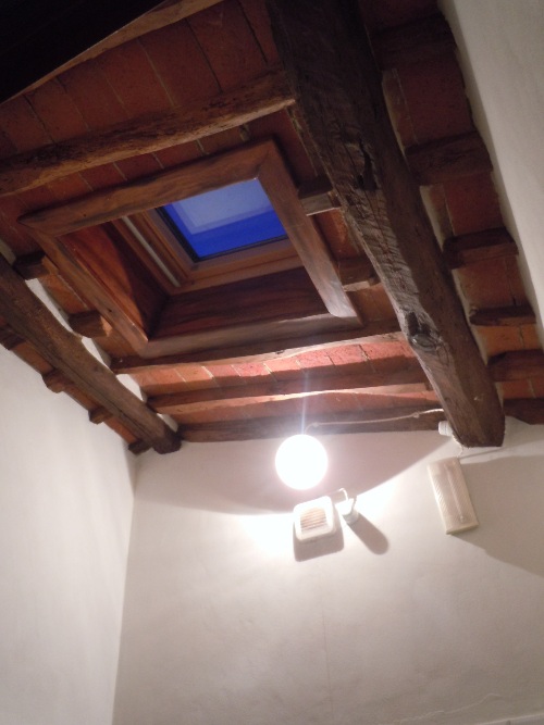 Oraz lazienka. We wszystkich apartamentach zostaly zachowane belki na sufitach. Rowniez w lazienkach. Dodatkowo zainstalowano luksfery: