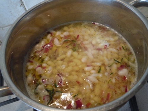 Kiedy fasola jest juz prawie miekka, dodajemy do niej zesmazona cebulke z rozmarynem.Gotujemy przez kilka minut.