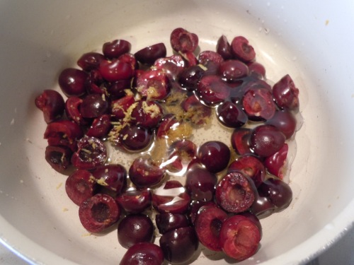 Do garnka wrzucamy czeresnie pokrojone na pol, starta skorke z cytryny (w przepisie oryginalnym wrzucono cala skorke cytryny, by na samym  koncu ja wyjac) oraz miod.