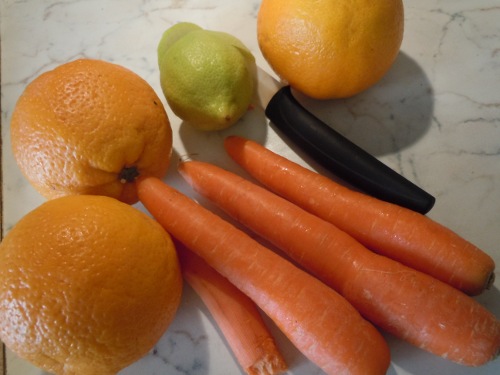 Pomarancza i cytryne obieramy ze skorki, kroimy na 2 lub wiecej czesci. Marchew obieramy. Wszystko wrzucamy do sokowirowki i gotowe!