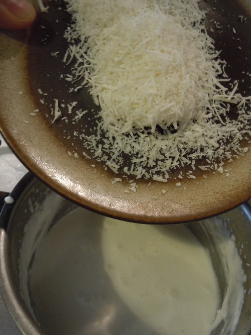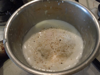 Do garnuszka wlewamy smietane, wsypujemy parmezan, sol i pieprz (wedlug smaku, zalecam malo soli, bo parmezan jest juz slony). Gotujemy na malym ogniu przez 10 minut.