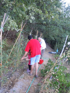 Na prawie samym dole znalezlismy poletko pomidorow i fasoli oraz drzewka owocowe. Susza strasznie dokucza uprawom, w tym roku wszystko rosnie, a potem nagle zostaje spalone przez slonce.