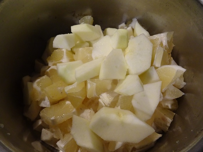Obrać cytryny ze skórki, pokroić na kawałki. Obrać jabłka, pozbawić szypułek. Pokroić na kawałki. Wrzucić do garnka wraz z cukrem.