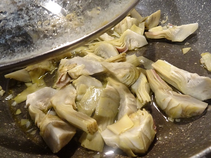 Karczochy obrać z twardych zewnętrznych liści, odkroić łodygę. Przekroić karczocha na cztery, oczyścić środekz kłujego wnętrza. Ćwiartki dusić pod przykryciem na oliwie z oliwek z dodatkiem posiekanego czosnku. Do duszenia można dodać trochę wody. Posolić do smaku.