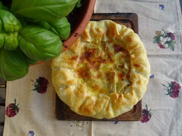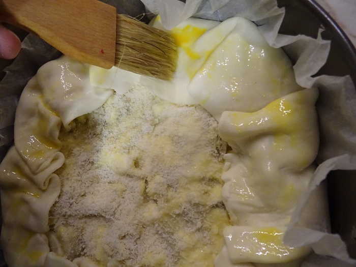 Ciasto franckuskie rozłożyć na papierze do pieczenia w tortownicy. Wlać masę karczochową. Zamknąć tartę ciastem francuskim. Wierzch posypać parmezanem. Brzegi ciasta posmarować roztrzepanym jajem.