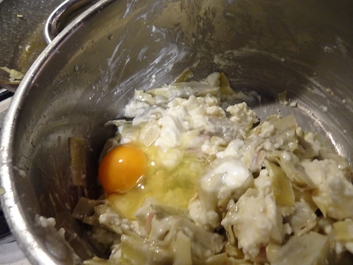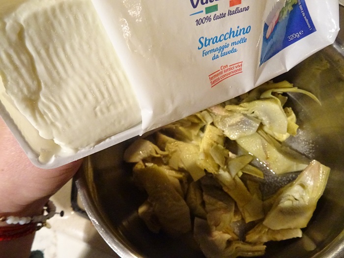 Odlać powstały płyn. Karczochy połączyć z serem stracchino i 1 jajem. Lekko zmiksować blenderem, ale pozostawić małe kawałki karczocha.