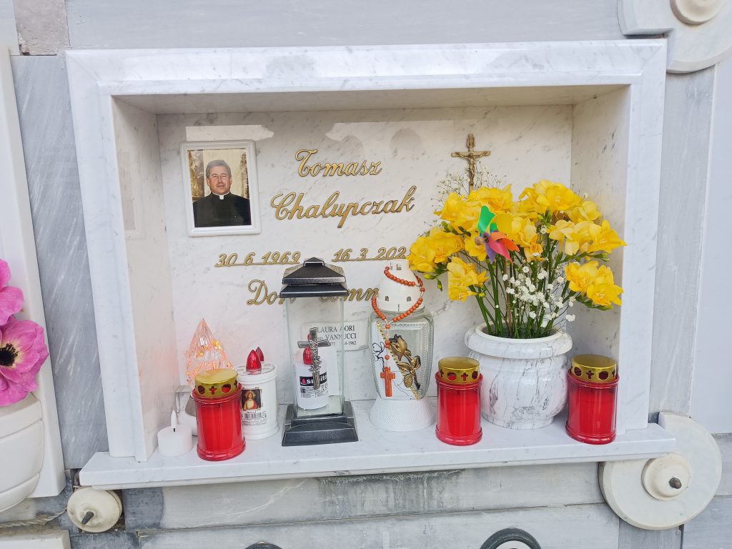 Pojechałyśmy zapalić znicze na grobie Księdza Tomasza Chałupczaka, którego nie ma już z nami od trzech lat. Było grubo po godzinie 18 i obawiałam się, że cmentarz może być zamknięty.