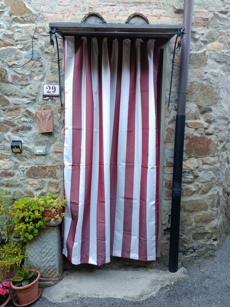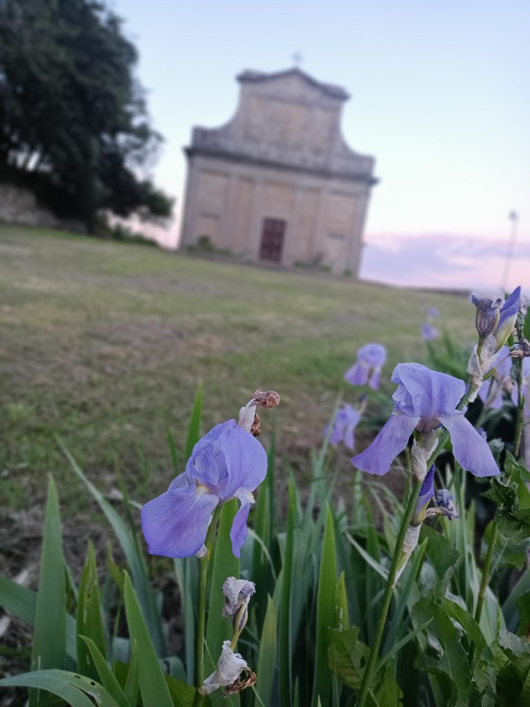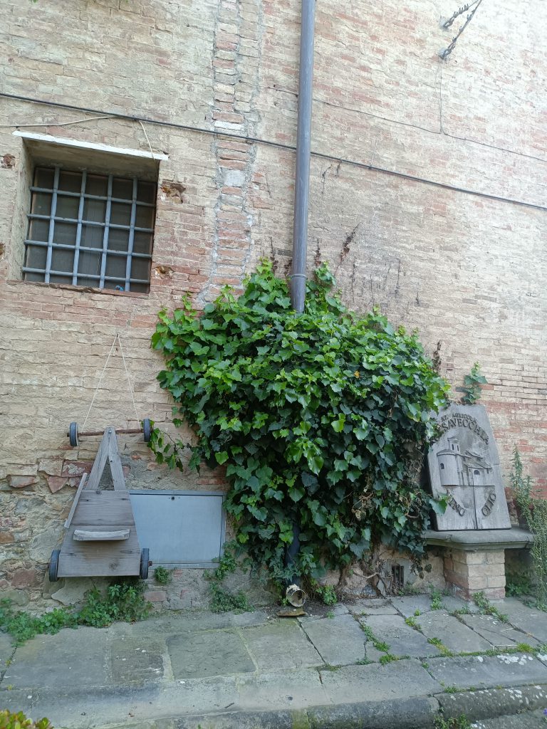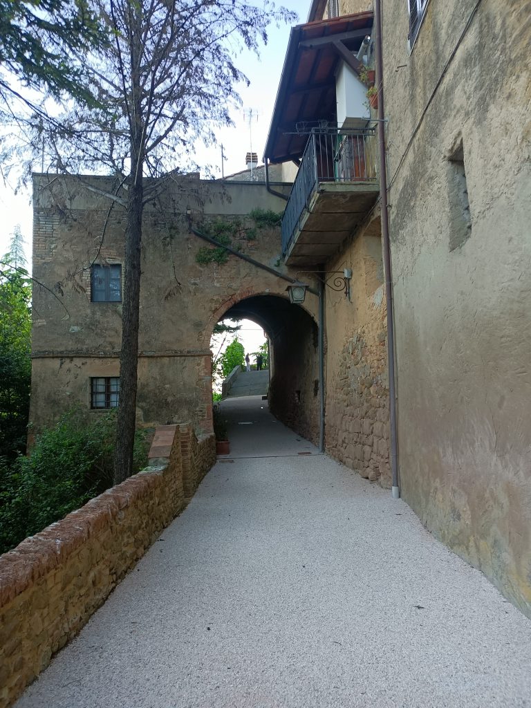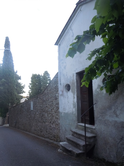 Pod centrum historycznym przebiega główna droga, ale nie ma tam raczej możliwości zaparkowania. Jest natomiast jeden lub dwa wąskie zjady na parking. Ja dopiero po trzecim namyśle (bo dwie wąskie ulice z parkingami mi się nie podobały) podjęłam decyzję zaparkowania przy hali sportowej, już na końcu miasta. Miejsc było sporo i parkowanie też było spokojne. Stąd ruszliśmy na lewo, gdzie na wejściu do miasta zauważyliśmy mały kościółek. Szukając informacji w internecie odkryłam, że prawdopodobnie chodzi o Oratororium (Oratorio della Compagnia della Santa Croce) chyba z XVII wieku.