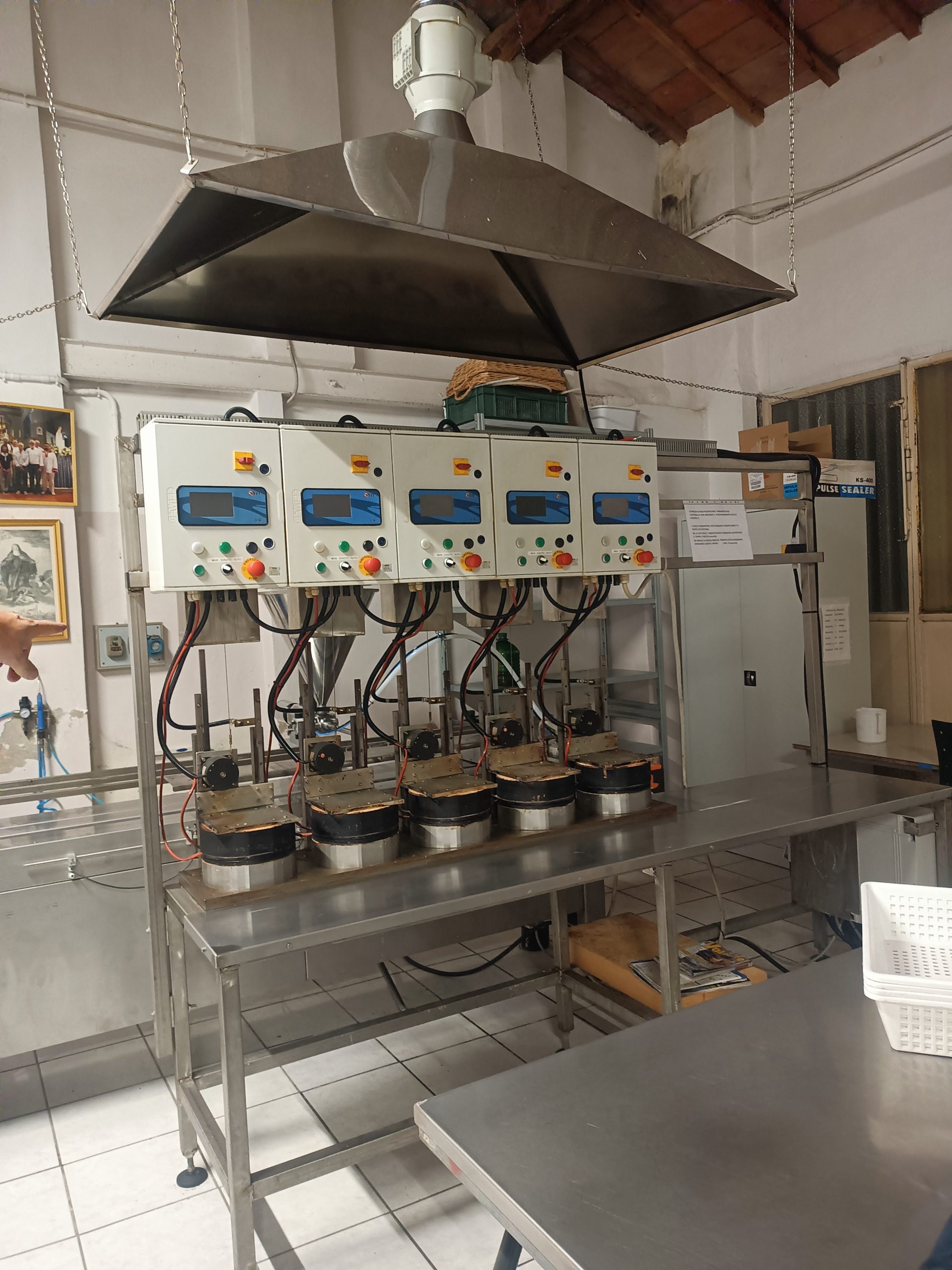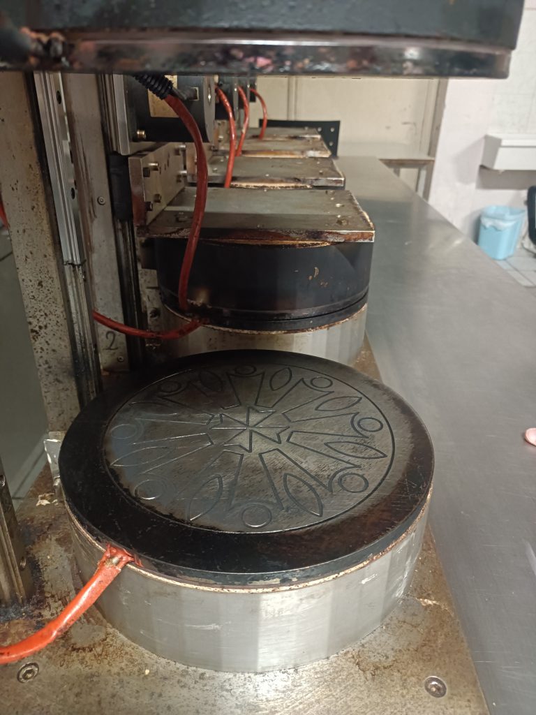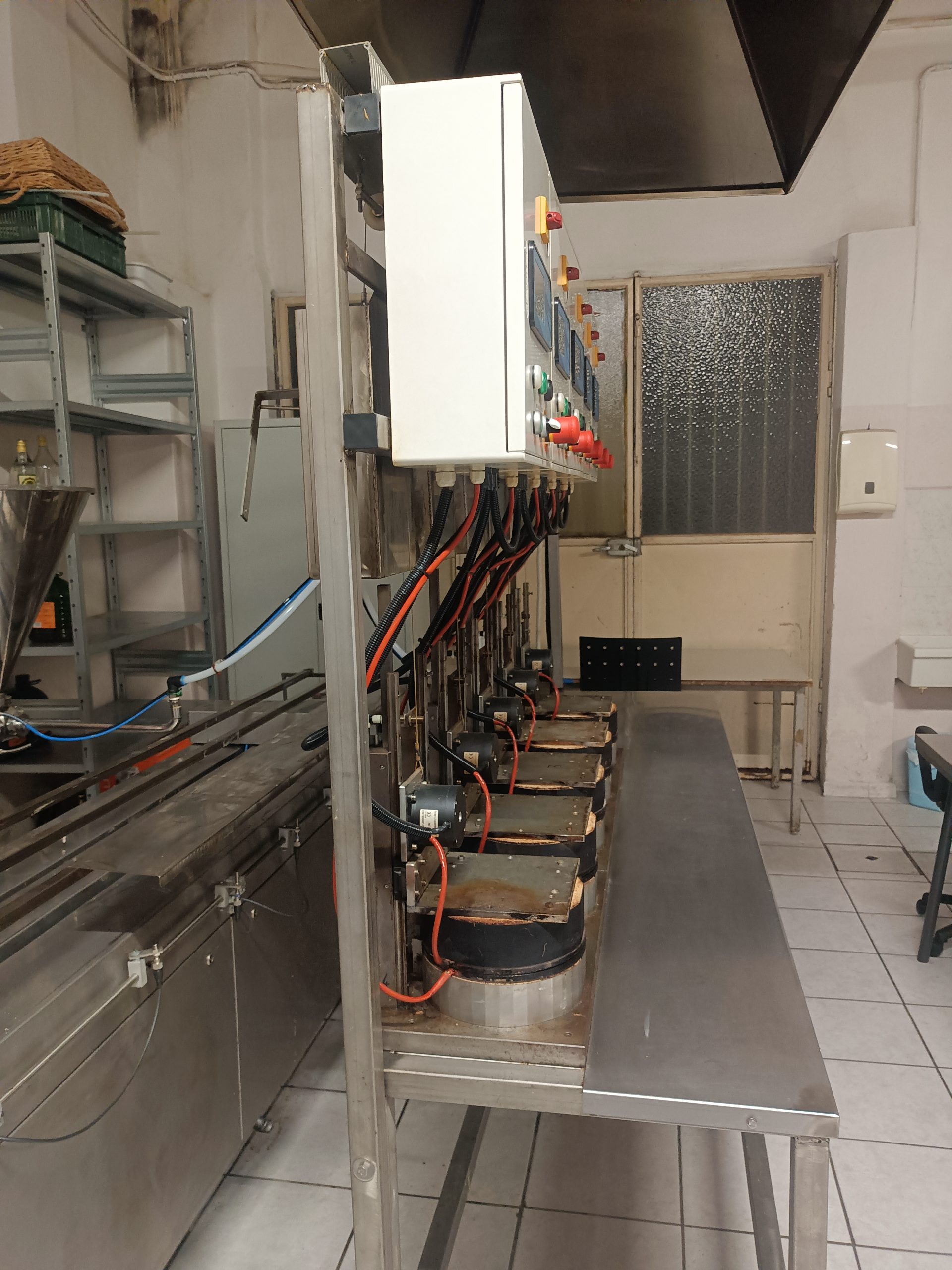 Ciasto przelewa się do dużego zbiornika, skąd zostaje rozprowadzone do specjalnych „podwójnych patelni-gofrownic”.