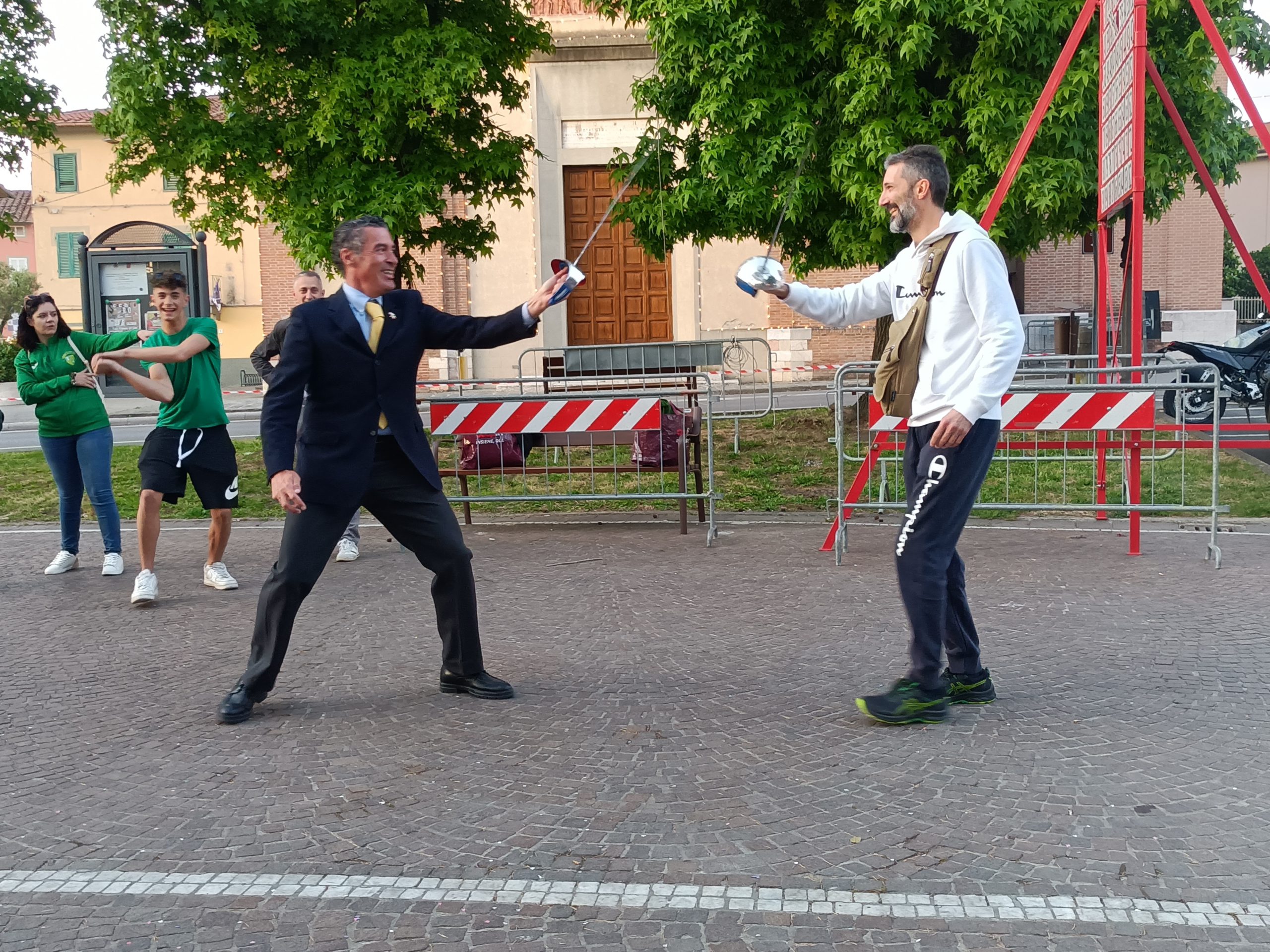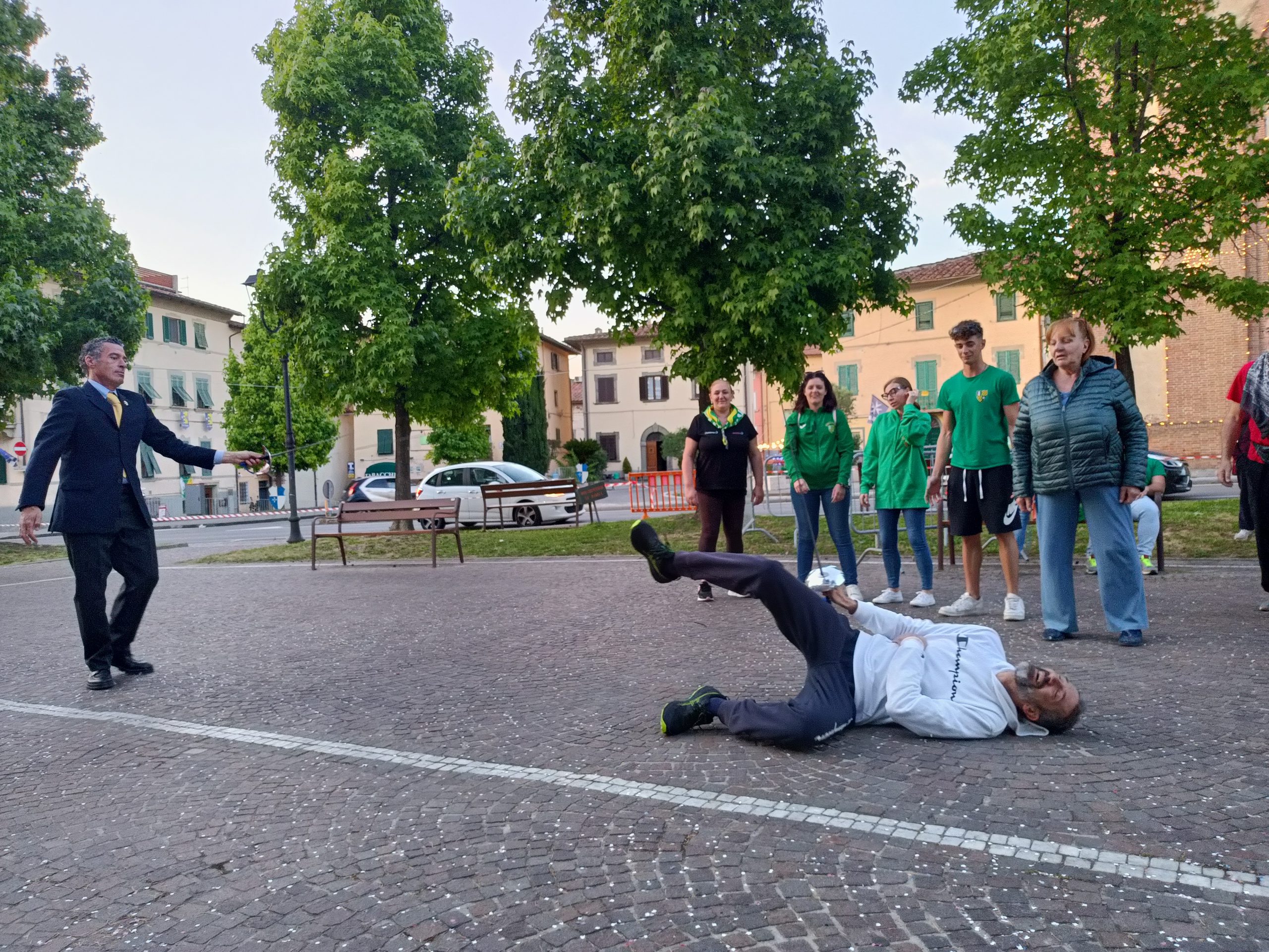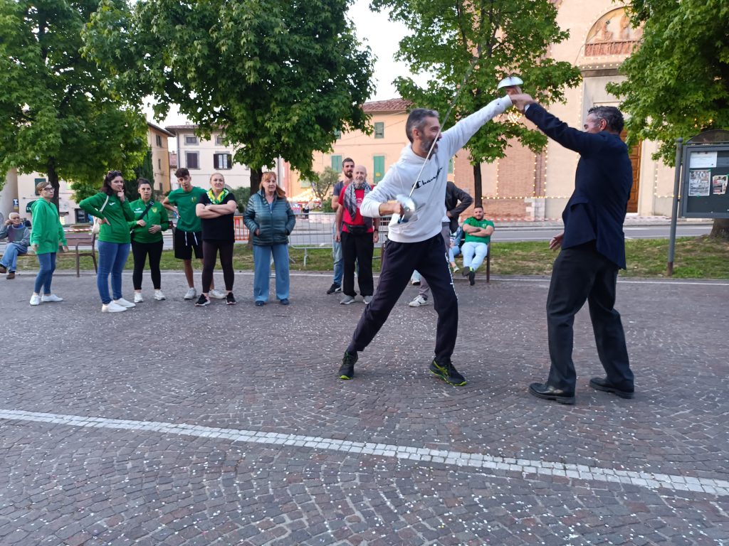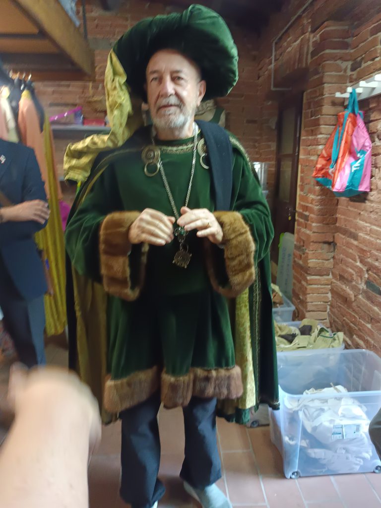 Po próbach kostiumowych przeszliśmy na plac, gdzie omawiano kwestię walki. Ustawiła się grupka osób z Rione La Nave i wymyślała, jak ta walka ma wyglądać. Kto ma paść na ziemię, komu ma wypaść szabla z rąk. Przyszedł też mężczyzna, który będzie grał rolę umarłego. Jeszcze nie wiemy kiedy jest jego kolejne tej całej paradzie. Wszystko okaże się jutro.