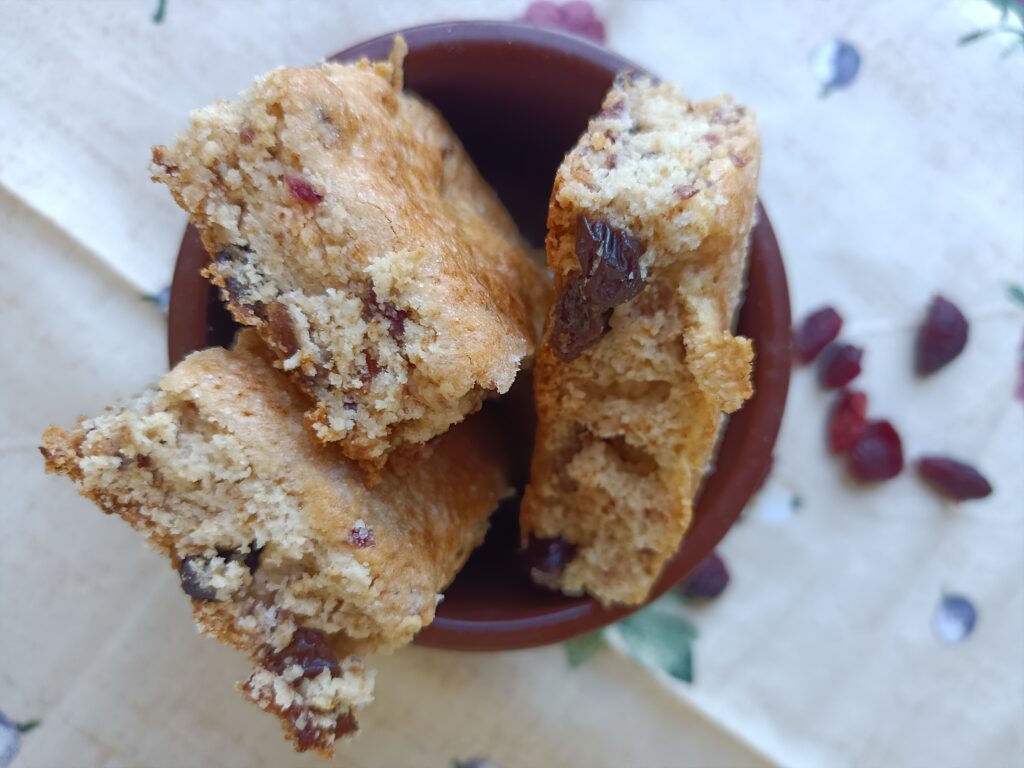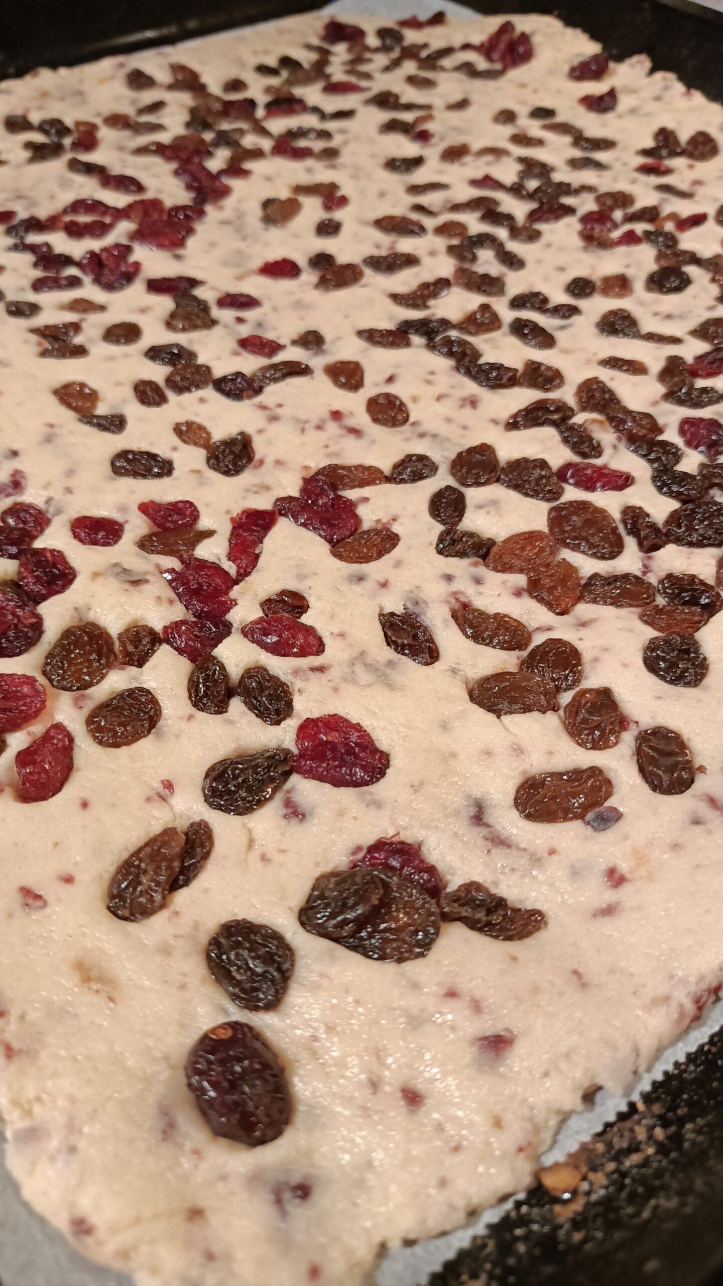 Są one bardzo łatwe w wykonaniu. Dodaje się do nich żurawinę. W internecie widziałam również wersję z rodzynkami dlatego postanowiłam ich trochę dodać. (dodatkowo dodałam cukier waniliowy). Ale z tego co wyczytałam oryginalne są z żurawiną.