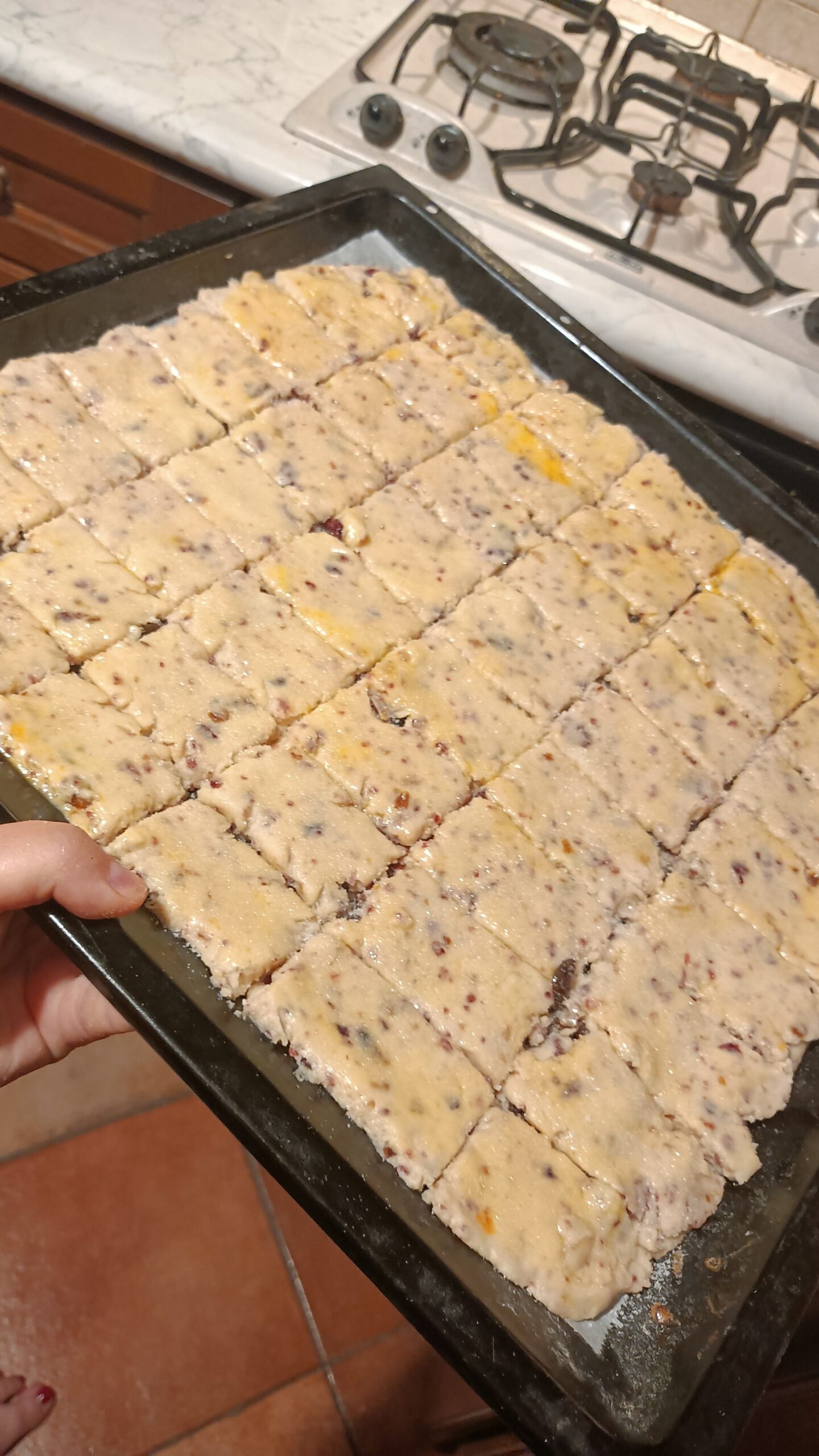 Po głębszej analizie przepisu doszłam do wniosku, że równie dobrze można by dwie części ciasta rozwałkować na cienko, pokroić na prostokąty i upiec. Mielibyśmy prawie 100 ciastek. Moim zdaniem biscotti di Garibaldi wcale nie muszą być dodatkowo faszerowane żurawiną.