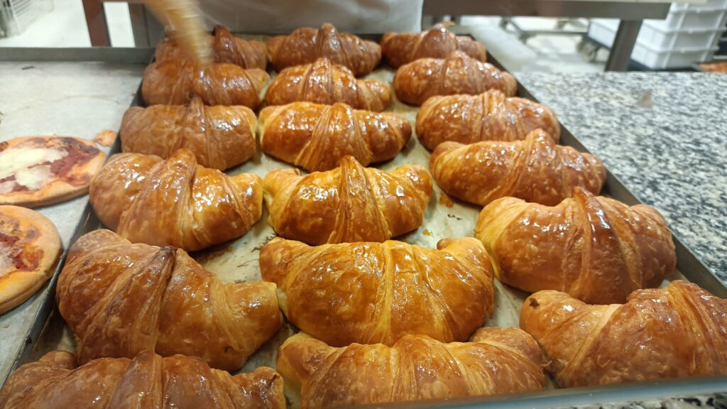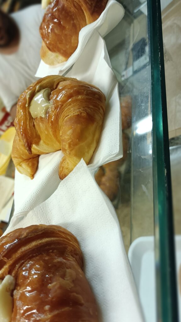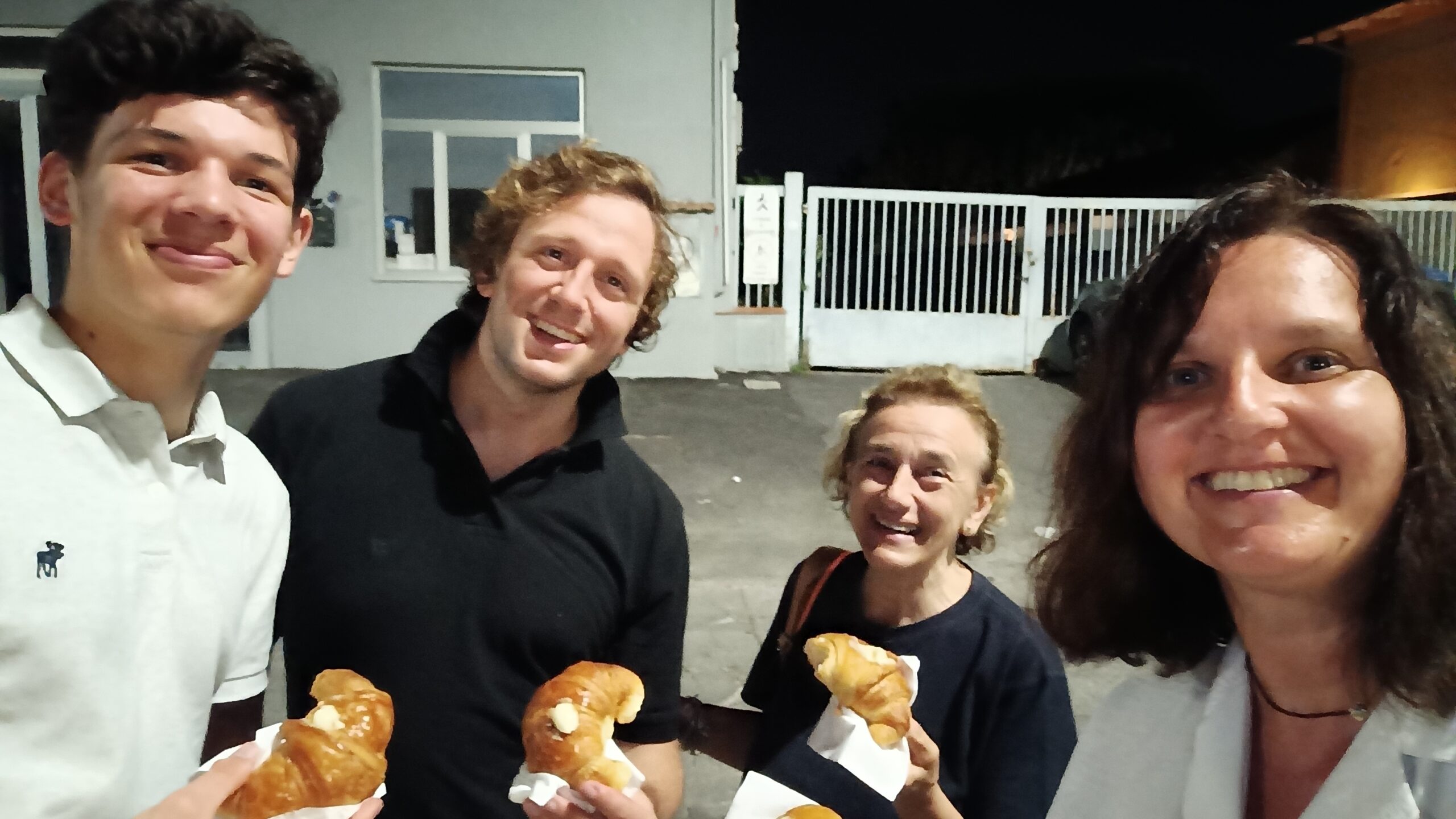 Z Annunziatą czekałyśmy na przylot jej syna. Samolot miał wylądować w Pizie o 23.50, a z powodu opóźnienia dotarł dopiero o 01.30. Noc była wyjątkowo ciemna, w oddali świecił ogromny kawał pomarańczowego księżyca. Z Annunziatą w aucie dotrzymywałyśmy sobie towarzystwa długą rozmową. Na lotnisku Andrea czekał już z Thomasem, pół Anglikiem, pół Francuzem. W powrotną drogę rozmowy toczyły się po włosku, francusku i angielsku. Do Pistoi dotarliśmy po 3 w nocy. Było nam wesoło i wcale nie mieliśmy ochoty na rozstanie i pójście spać. Postanowiłam zabrać grupę do nocnej cukierni. Przed drzwiami stało parę osób. Tam zawsze w nocy jest ruch. Nie ma się czemu dziwić. Świeże wypieki prosto z pieca nadziewane są na naszych oczach dżemem czy kremami.