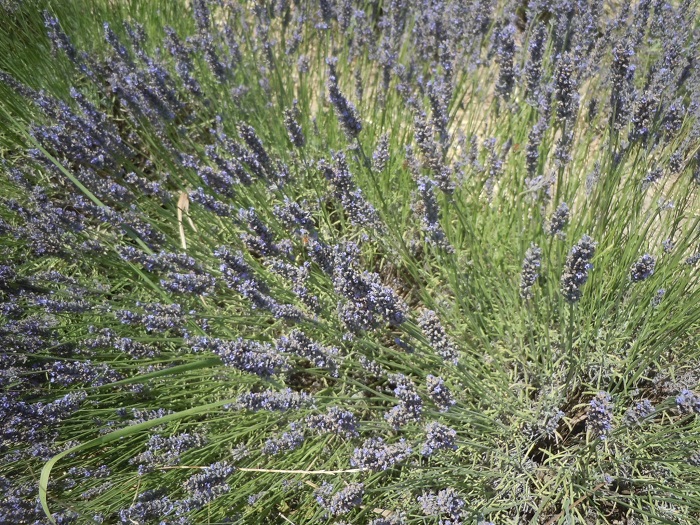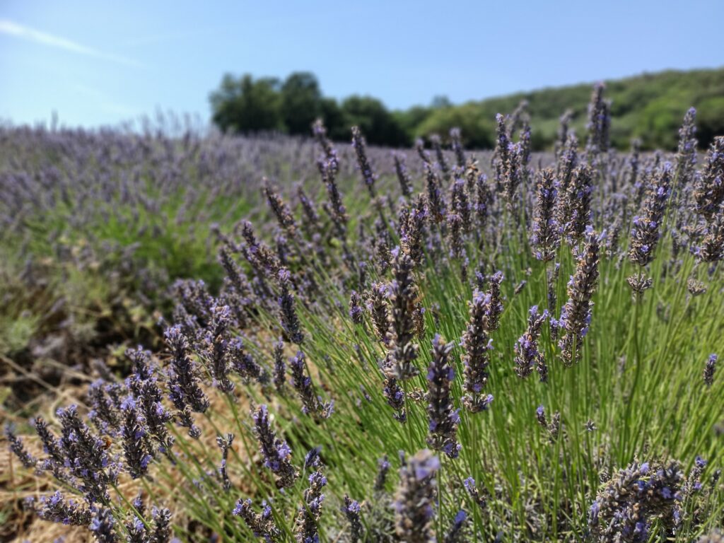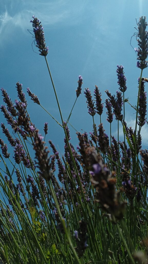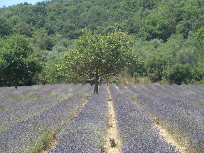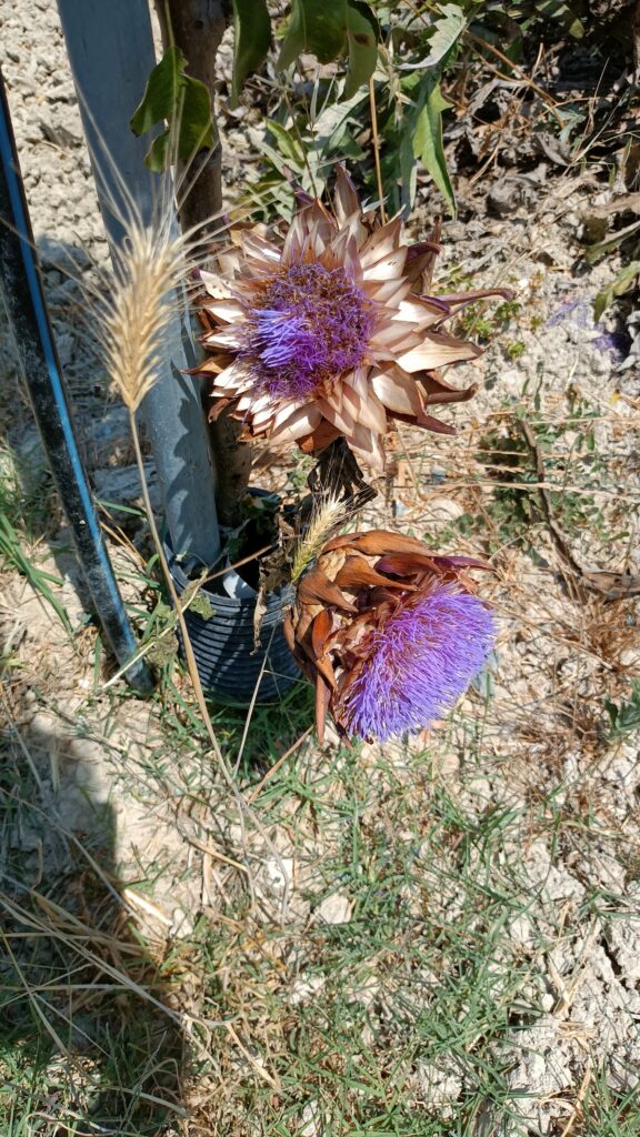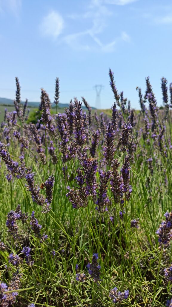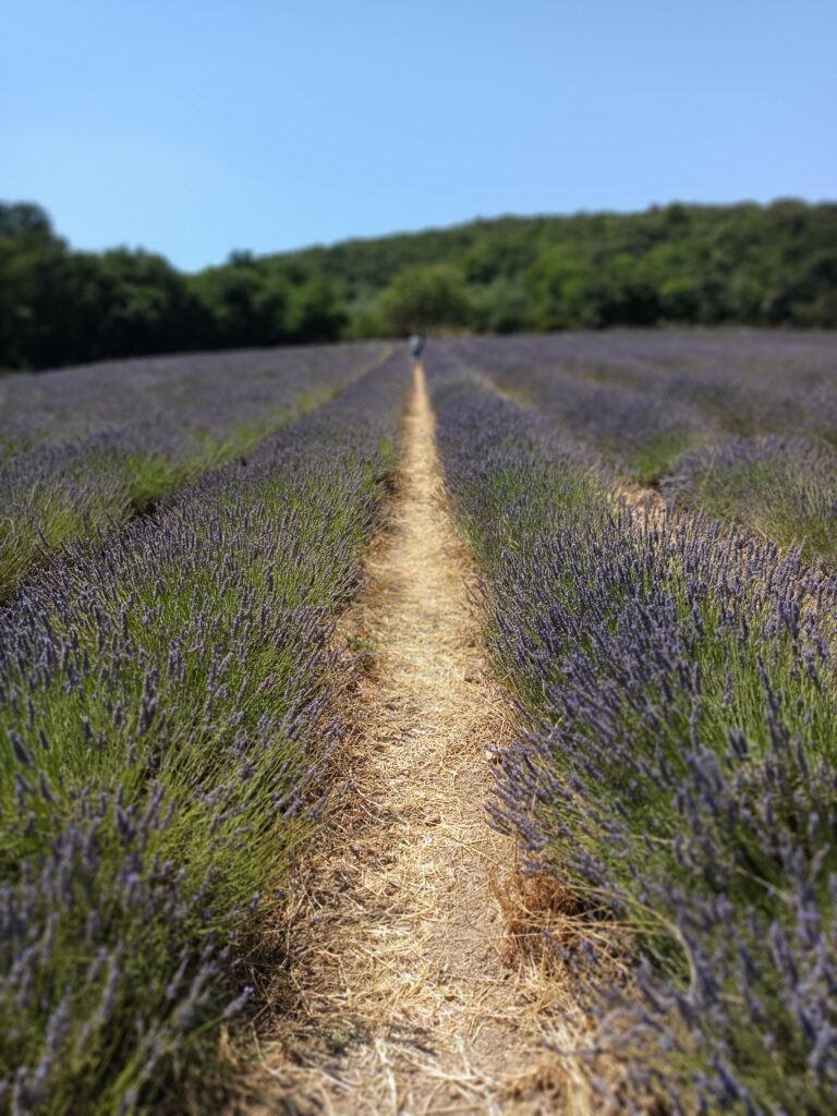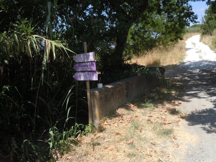 W dniu, w którym byliśmy było 46 stopni. Byliśmy jedyni. Nie za bardzo wiedzieliśmy gdzie to pole lawendy znajduje się, więc poszliśmy w stronę domostw. Zauważyliśmy ogromne drzewo figowe, rząd karczochów, które przekwitły, śliwę i jeden rząd lawendy.