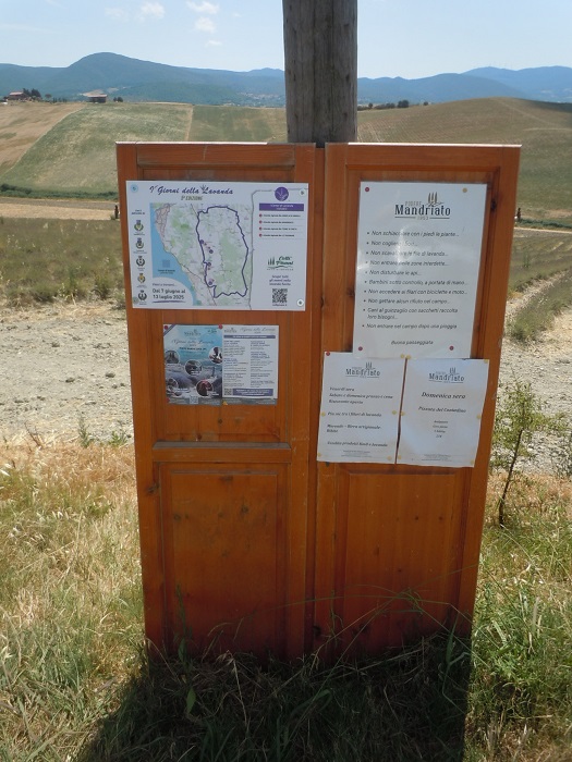 Niestety to pole w tym roku ma ciemnoszary kolor. Płatki lawendy odpadły z powodu upałów. Przy ulicy postawiona jest drewniana tablica z informacjami na temat różnych eventów. Jest też mapka wszystkich gospodarstw, które biorą udział w inicjatywie.