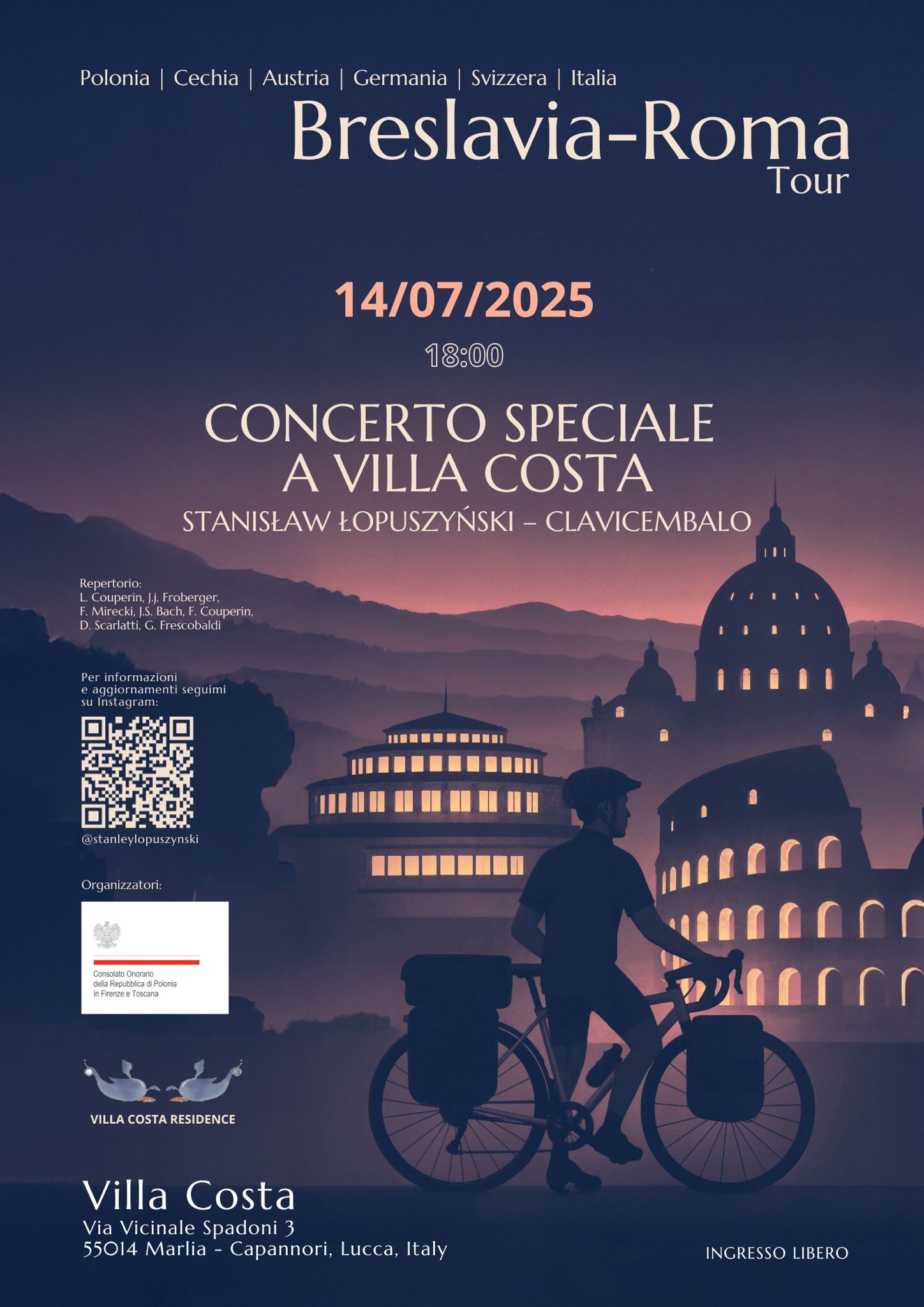 W najbliższy poniedziałek, 14 lipca o godzinie 18.00 w Willi Marlia (w gminie Capannori), której właścicielką jest Polka Maria Bandoni, odbędzie się koncert Stanisława Łopuszyńskiego. Zagra na klawesynie.