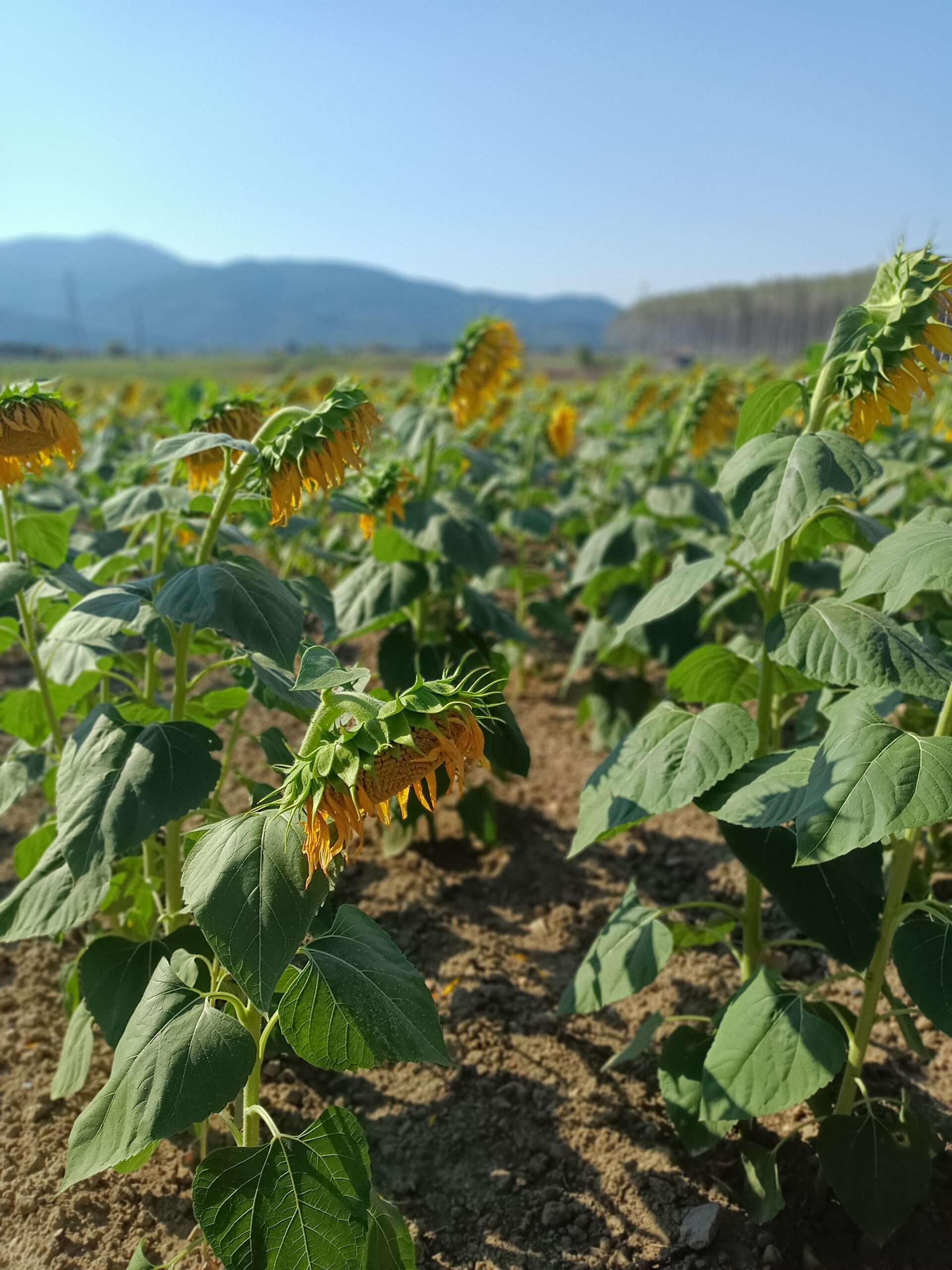 Mijaliśmy pola słoneczników. Na jednym słoneczniki były już bardzo dojrzałe i pozbawione żółtych płatków. Wyglądały trochę smutno. Na drugim natomiast znajdowały się młode słoneczniki.