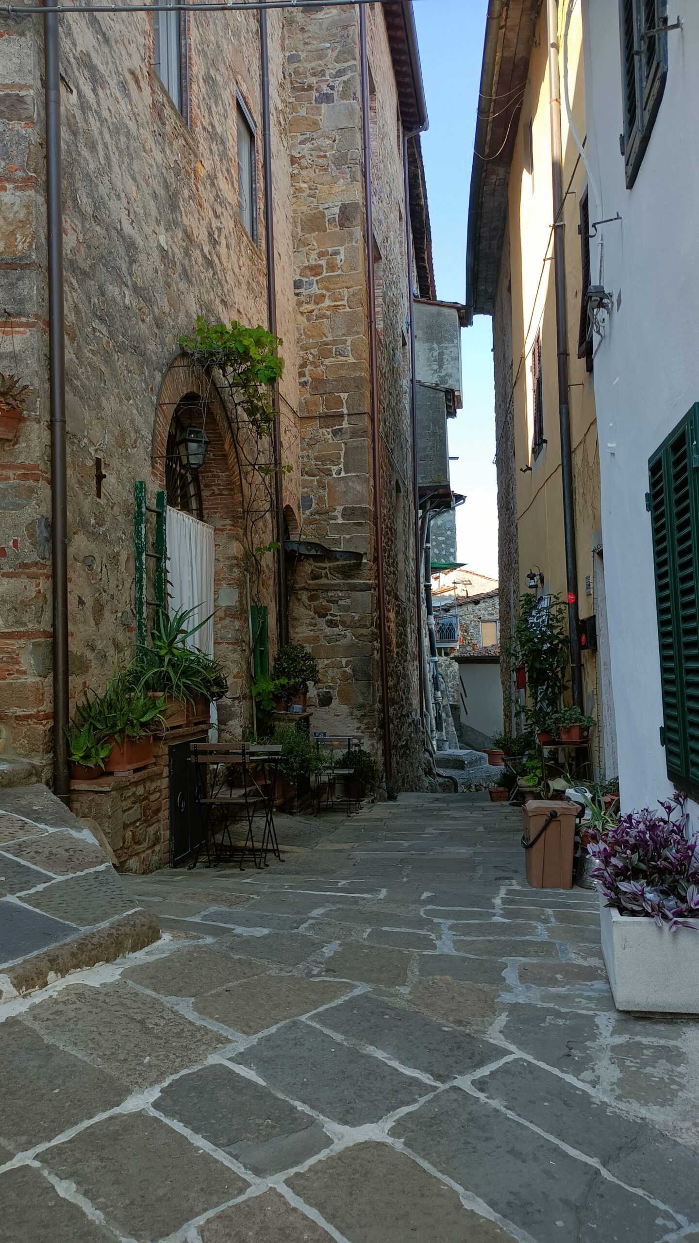 W barze jeden pan wyjaśnił, że to jest też Castelvecchio di Compito, ciąg dalszy miasteczka z dołu. Postanowiliśmy zerknąć na nie z bliska. Podjechaliśmy niezbyt szeroka drogą. Zostawiliśmy auto tuż przed wjazdem, przy drodze był mały parking. Przez samo miasto przejeżdża droga, ale jest wąska i oczywiście dwukierunkowa.