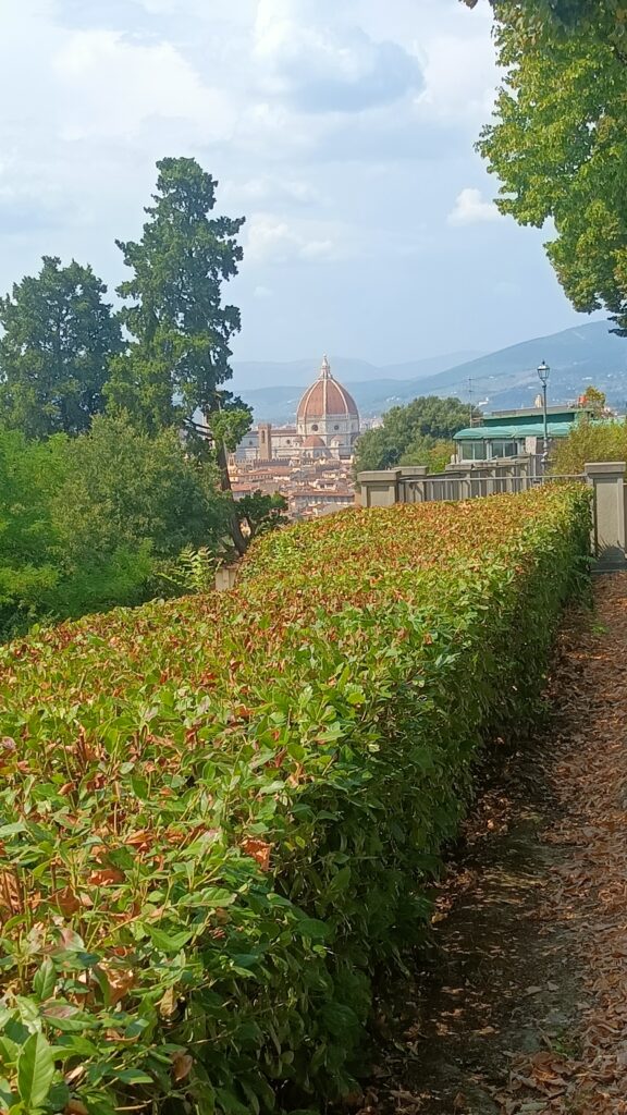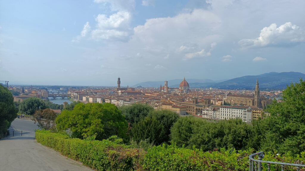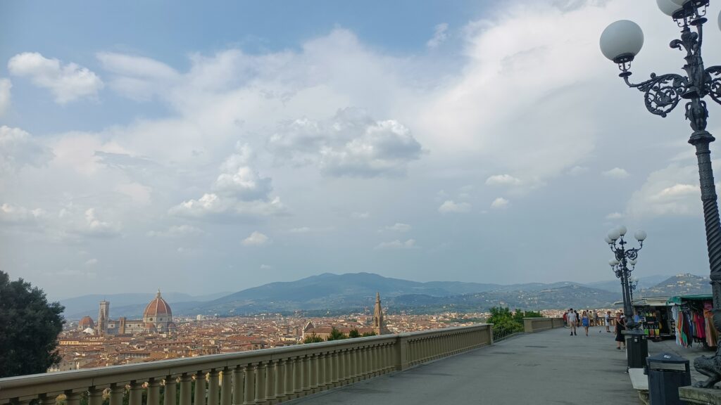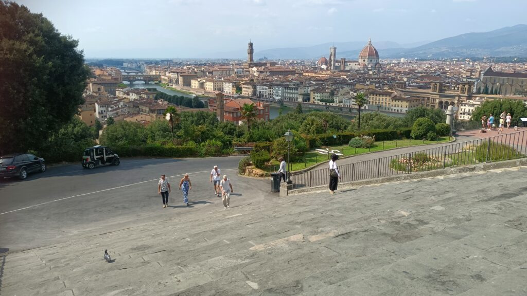 W centrum miasta jest jeszcze pieszy ruch, chodzą zorganizowane grupy z przewodnikami. Natomiast na Piazzale Michelangelo jest pusto. Przecież mamy sierpień, wakacje w toku! Ale jest gorąco i może mało komu chce się wspiąć na panoramiczny plac.