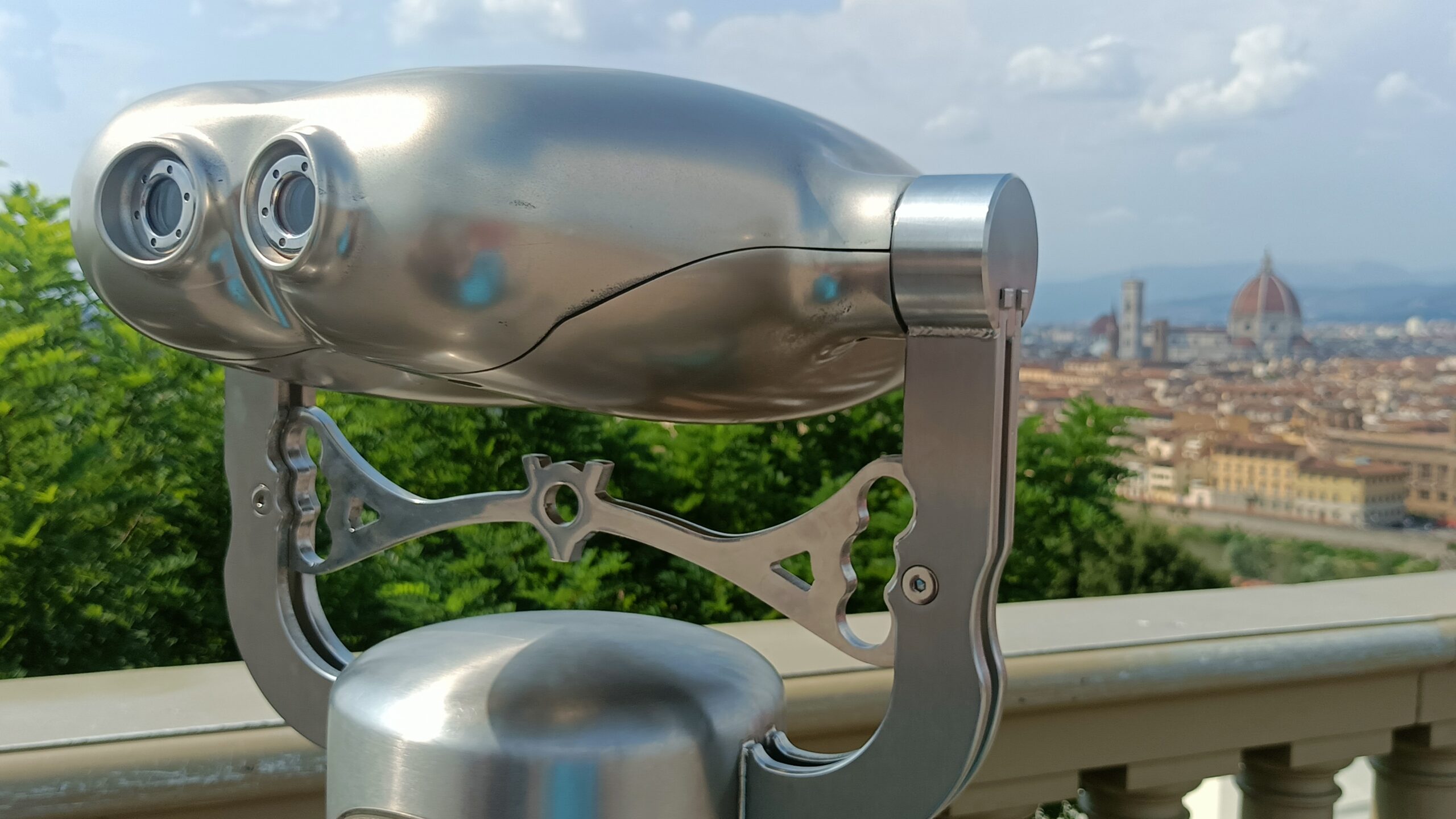 Zmiana w trendach turystycznych we Florencji. Puste Piazzale Michelangelo i fioletowe parkometry.