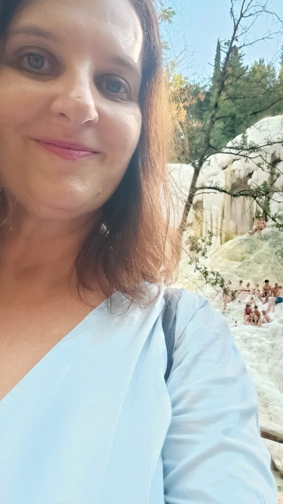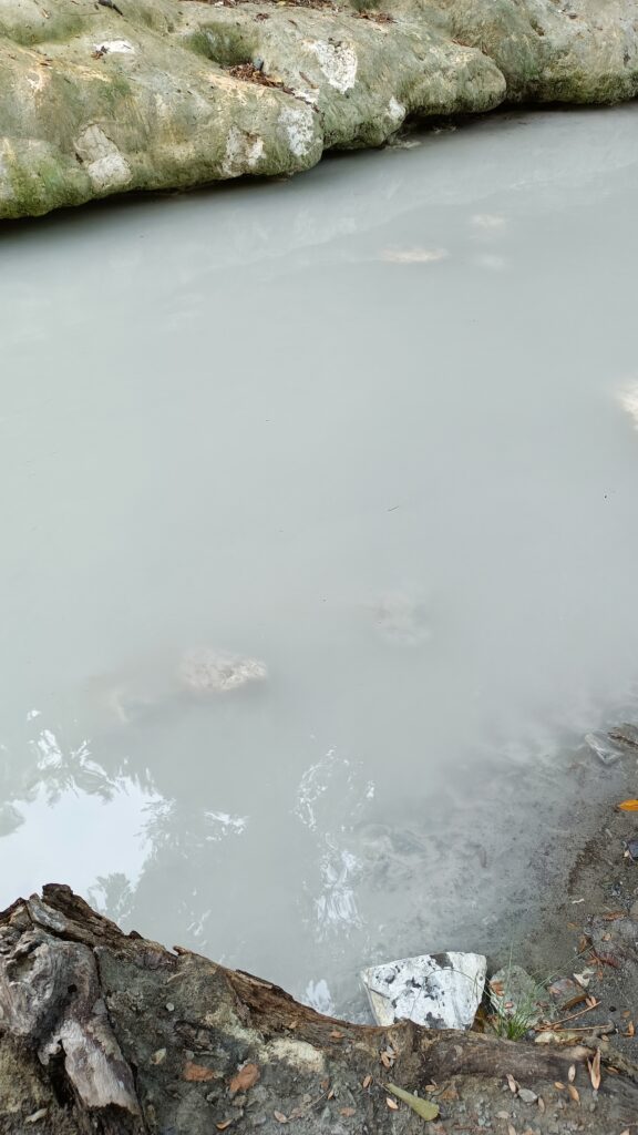Dopiero opuszczając to miejsce zauważyłam tablice informujące w dwóch językach o zakazie wchodzenia na skały. Nie chodzi o to, że woda jest trująca. Wręcz odwrotnie: ludzie przyjeżdżają się tu moczyć, bo są to wody termalne. W powietrzu unosi się zapach zgniłych jaj. Jest to spowodowane obecnością siarkowodoru, który jest naturalnym związkiem chemicznym powstającym na przykład w pobliżu źródeł termalnych. Wody nie są gorące, ale letnie. Zabarwione są na biały kolor, co jest wynikiem obecności wapna.