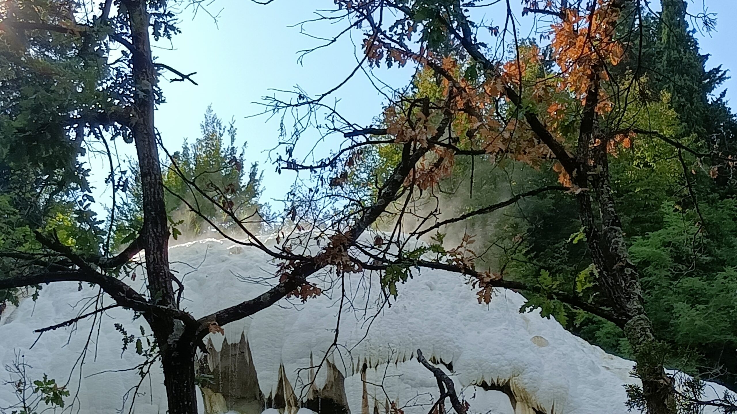 Dopiero opuszczając to miejsce zauważyłam tablice informujące w dwóch językach o zakazie wchodzenia na skały. Nie chodzi o to, że woda jest trująca. Wręcz odwrotnie: ludzie przyjeżdżają się tu moczyć, bo są to wody termalne. W powietrzu unosi się zapach zgniłych jaj. Jest to spowodowane obecnością siarkowodoru, który jest naturalnym związkiem chemicznym powstającym na przykład w pobliżu źródeł termalnych. Wody nie są gorące, ale letnie. Zabarwione są na biały kolor, co jest wynikiem obecności wapna.