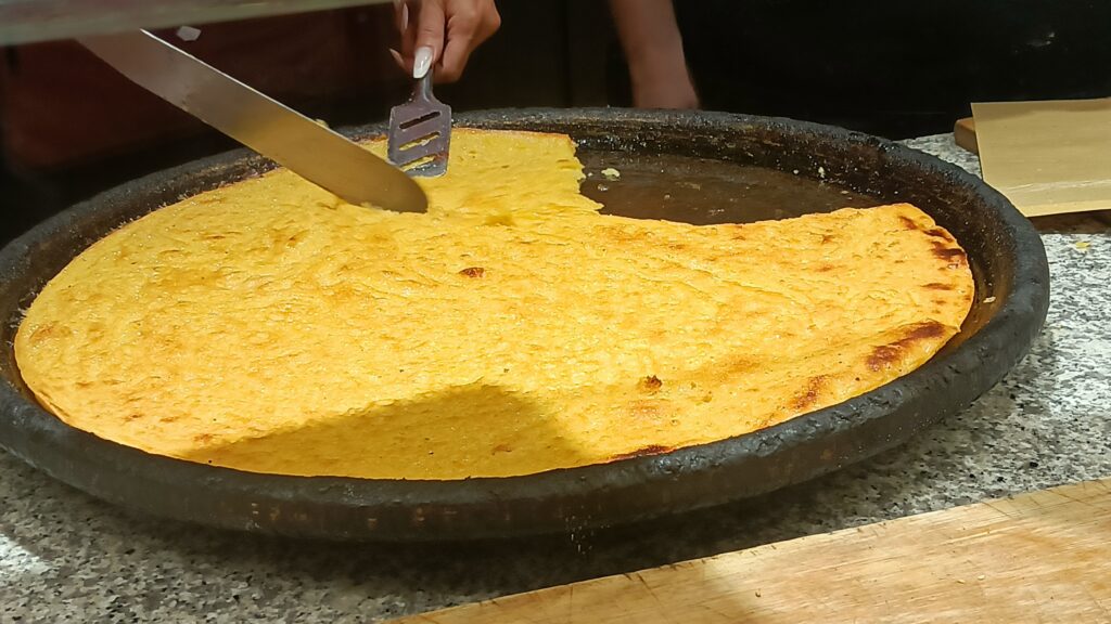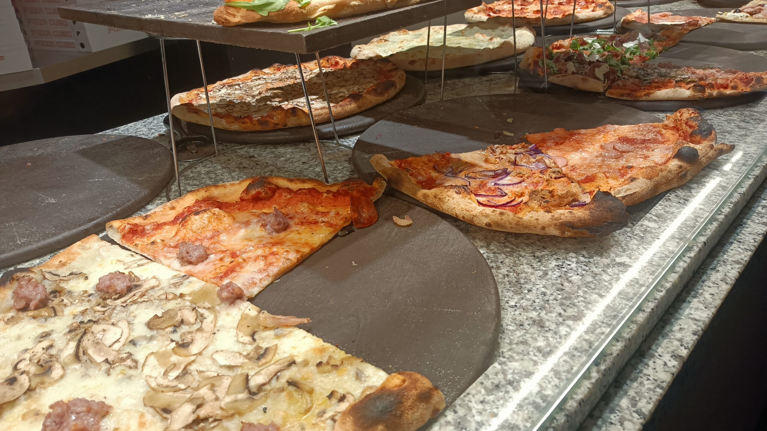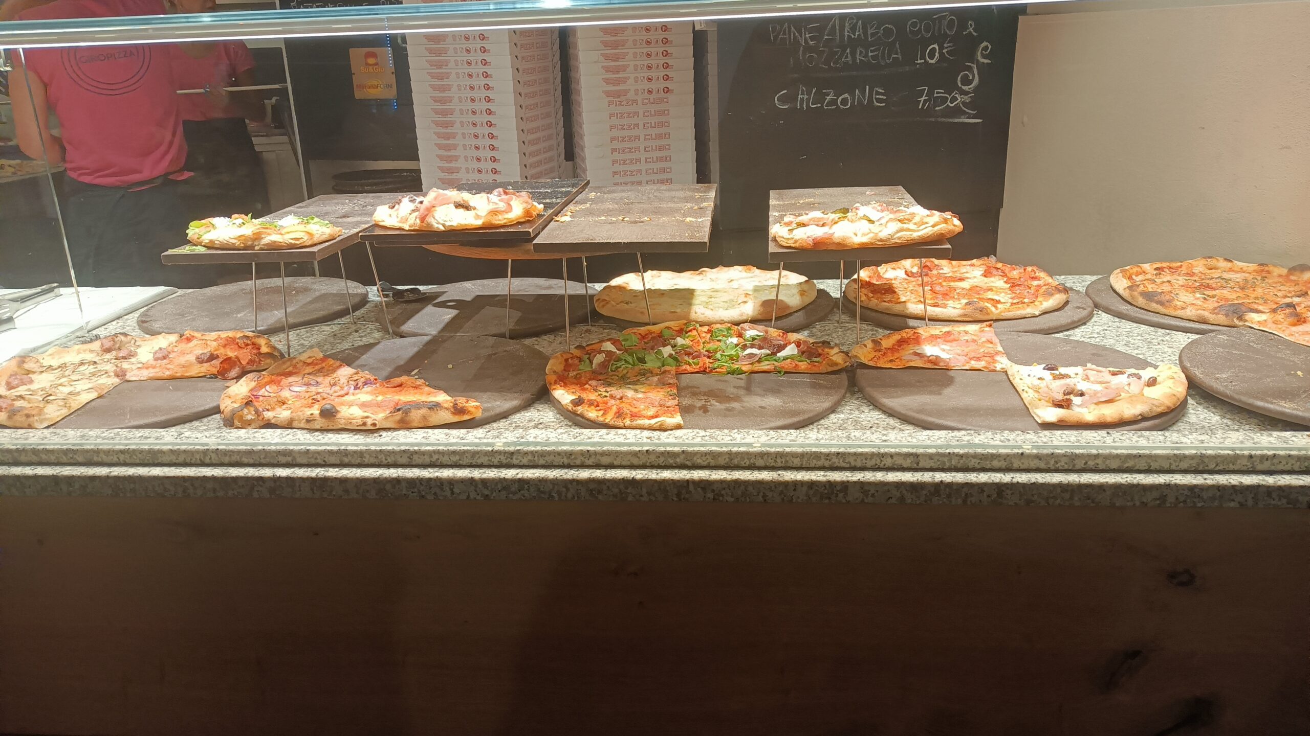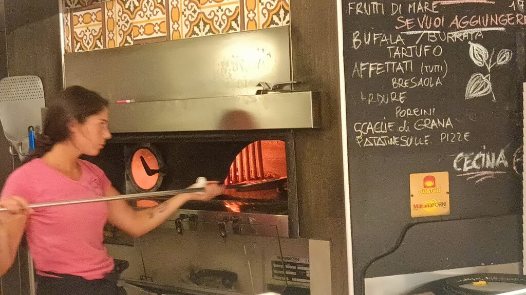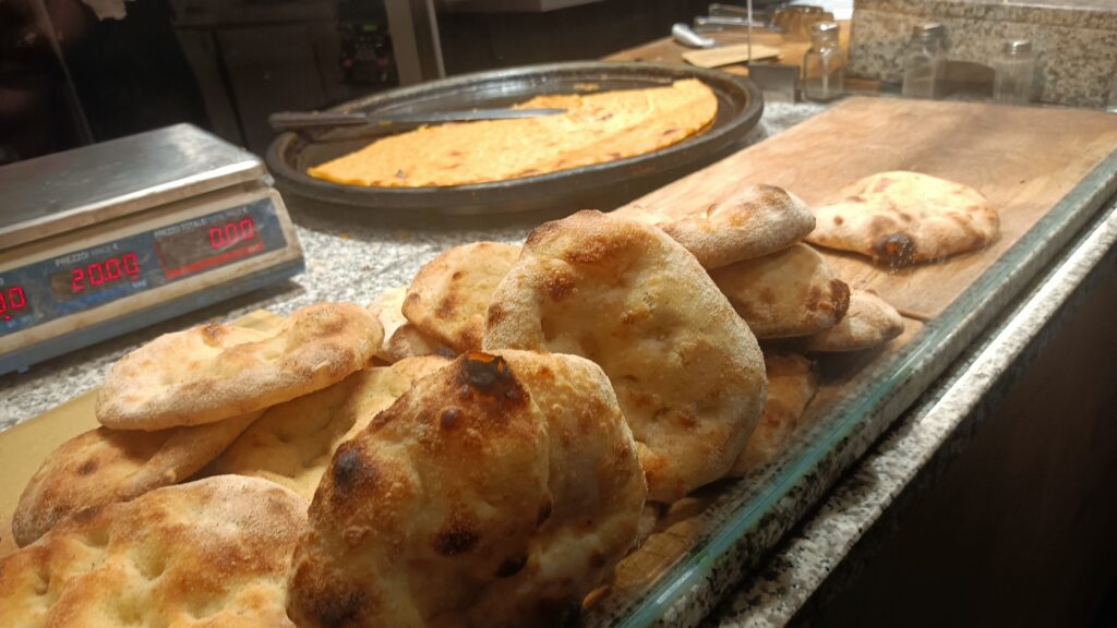 Przy ladzie obsługują trzy panie, pozostali kręcą się z tyłu. Jedni szykują pizzę, inni wkładają ją do pieca. Jest też słynny w tych rejonach placek z mąki z ciecierzycy i jest on tak wielki jak ostatnio w Pontederze (link tutaj).