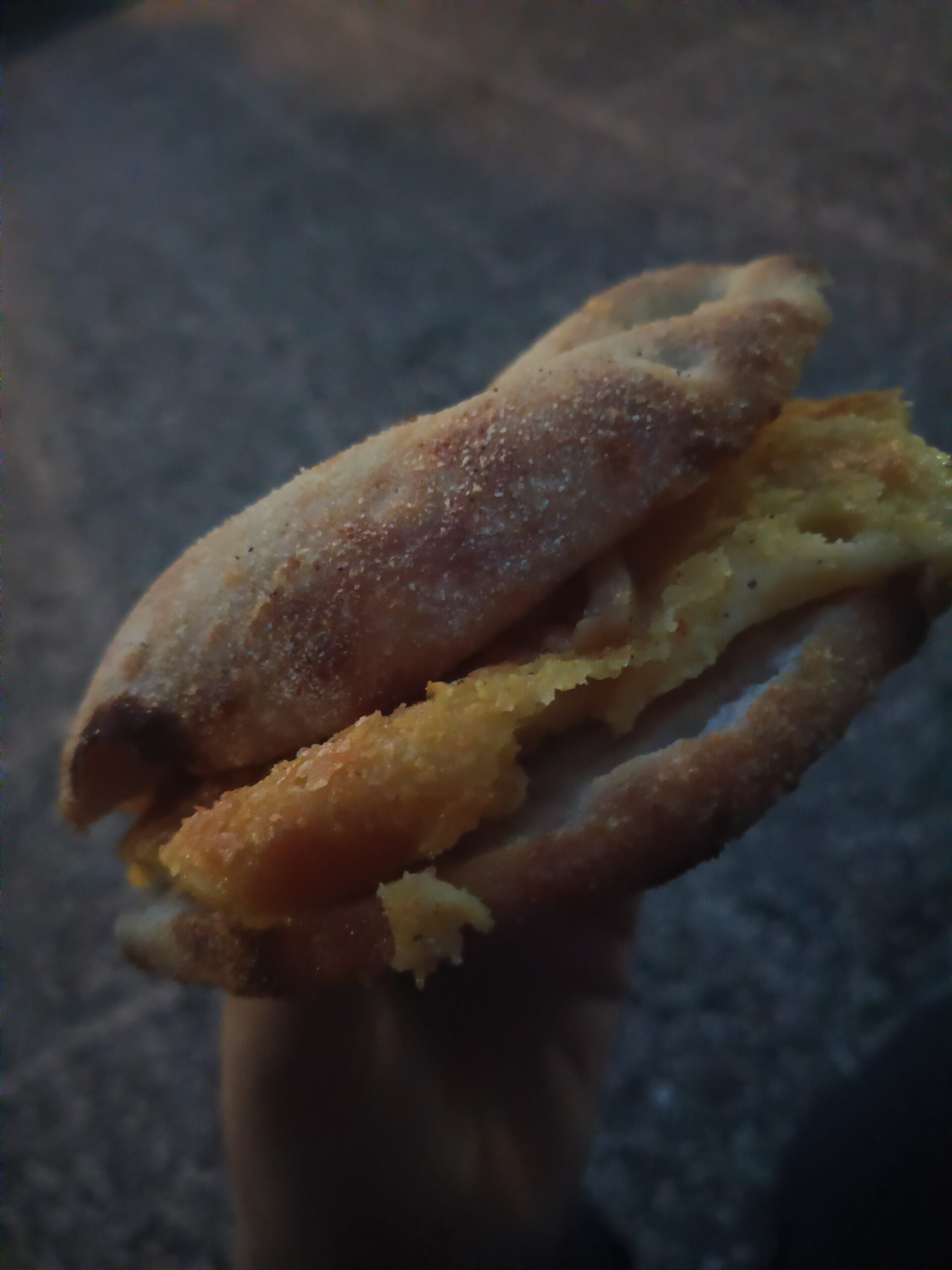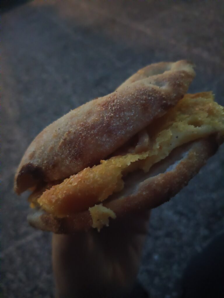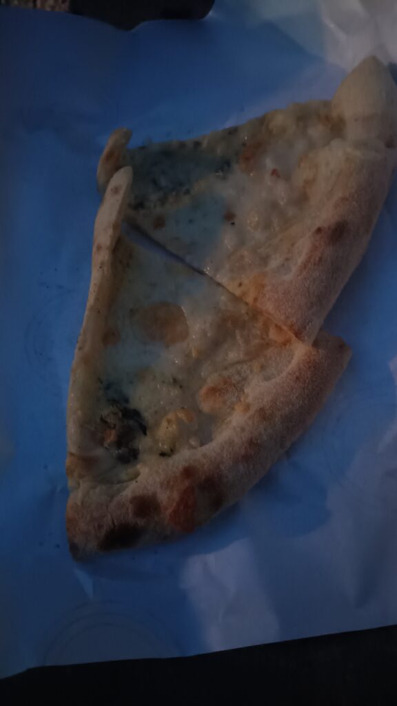 Bakłażanów w kanapce nie ma sporo, wyczuwalne są więc „gdzieś z daleka”. Pieprzu natomiast jest sporo, ale to dlatego, że tak poprosiliśmy. Bułka jest spora, bo ładnie wyrośnięta. Podawana na zimno. Na wierzchu wyczuwa się mąki z semoli. Pizzaioli używają jej do wyrabiania placków pizzowych czy schiacciaty i focacci. Placek z mąki z ciecierzycy cienki, ale „nie lejący się” jak ostatnio w Pontederze. Jest wypieczony, ale nie na sucho. W punkt. Placek był ciepły, bo niedawno wyszedł z pieca.