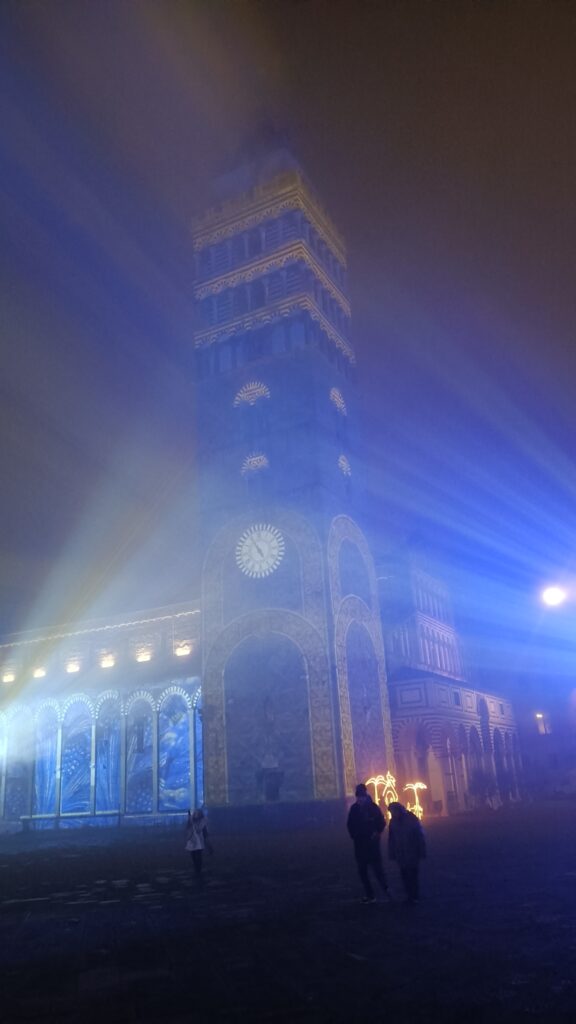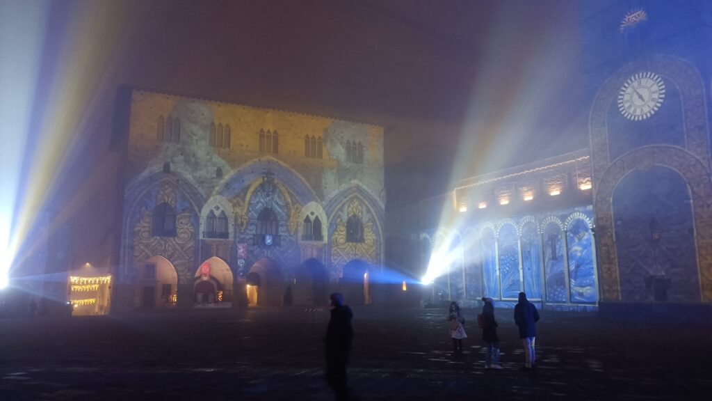 Chodzi o rzucane cyfrowe grafiki na główne budynki. Wszystko się mieni i błyszczy. Powiedziałabym, że jest dynamicznie. Trafiłam na mglisty wieczór co dodało dodatkowo takiego tajemniczego efektu.