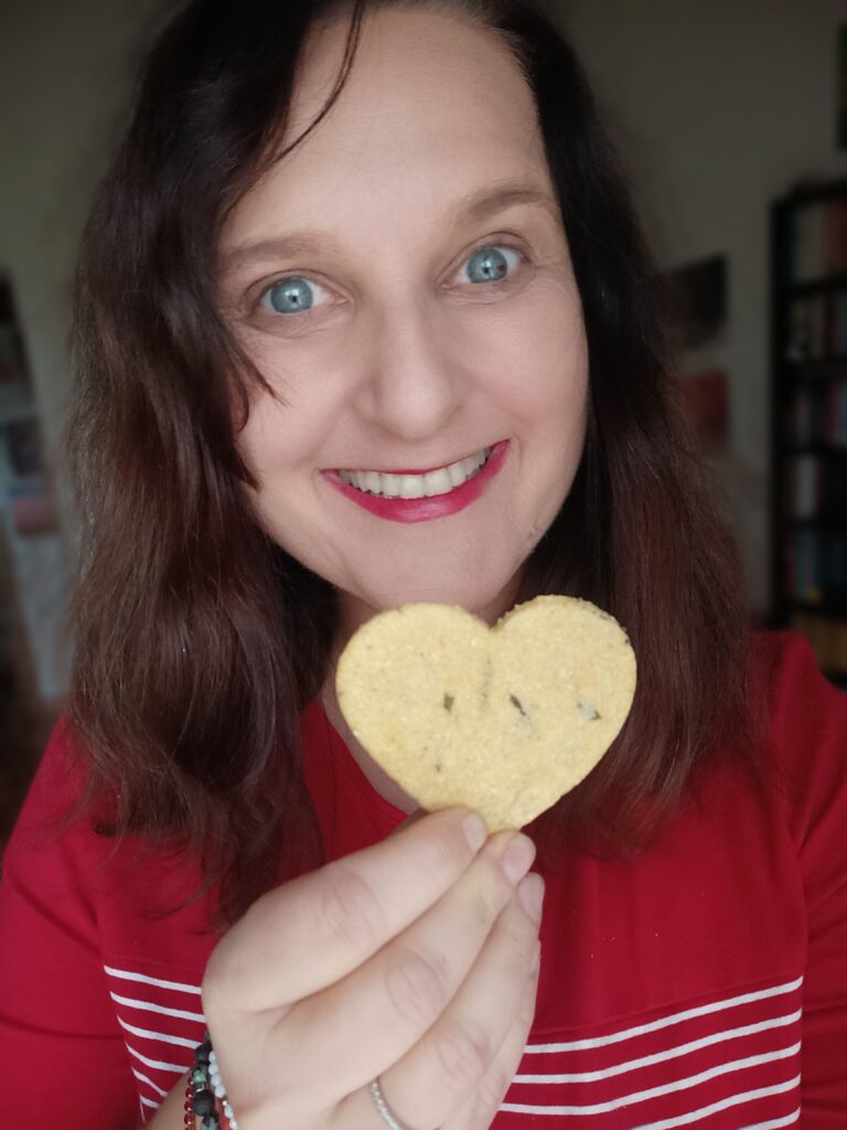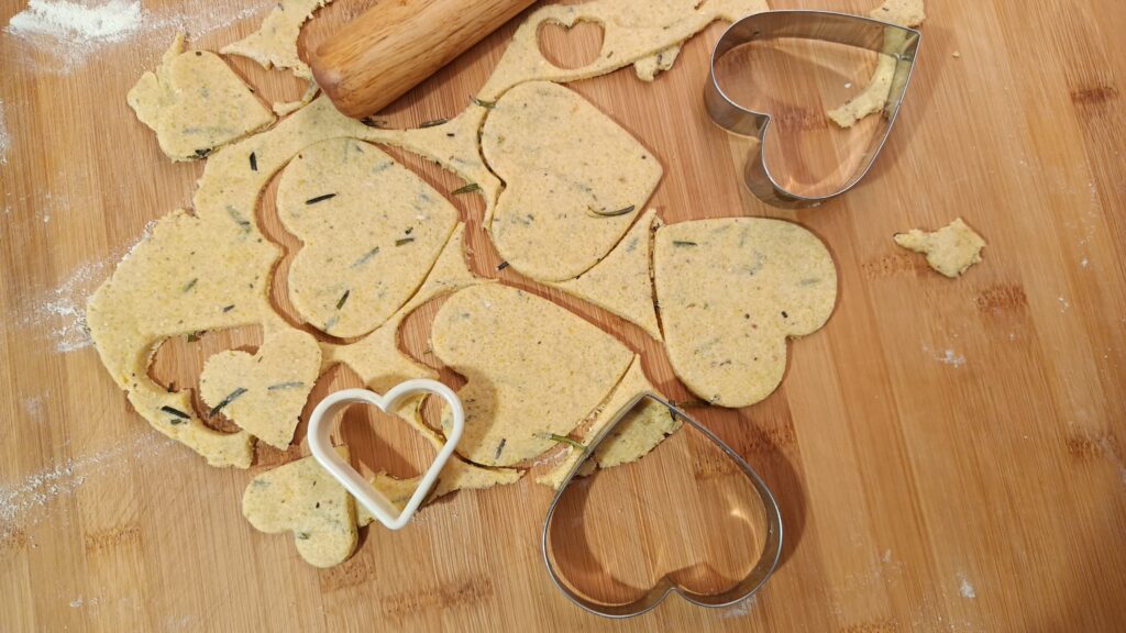 Kulę ciasta posypać mąką, rozwałkować. Wyciąć serduszka.