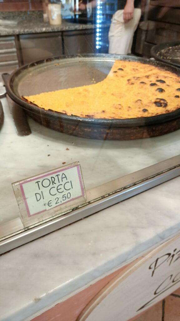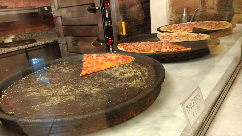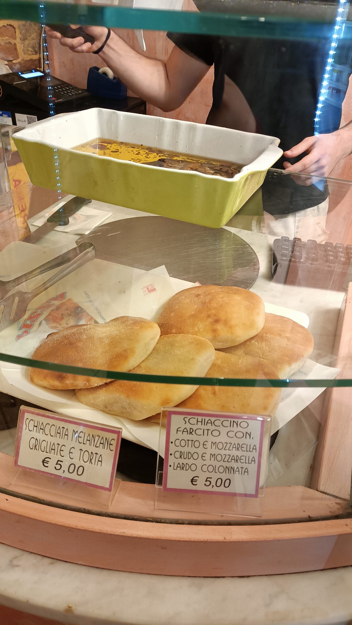 Właściciel, widząc nasze zainteresowanie plackiem z ciecierzycy powiedział, że ma również grillowane bakłażany w oliwie. Natomiast pieprz akurat się skończył, więc zaproponował peperoncino w proszku. Niezbyt pikantne, nadawało dosłownie lekko ostrzejszy smak kanapce.