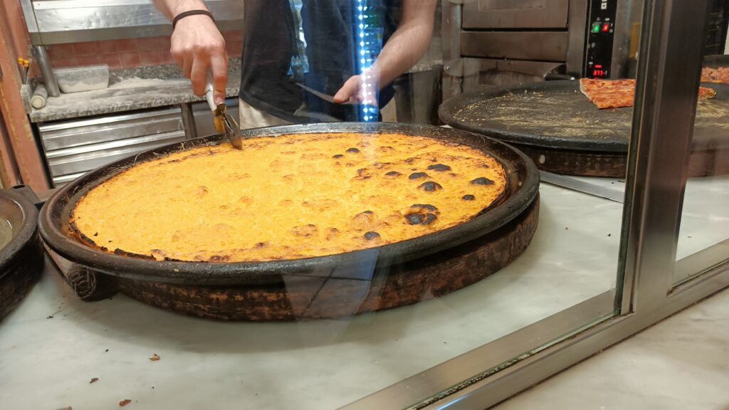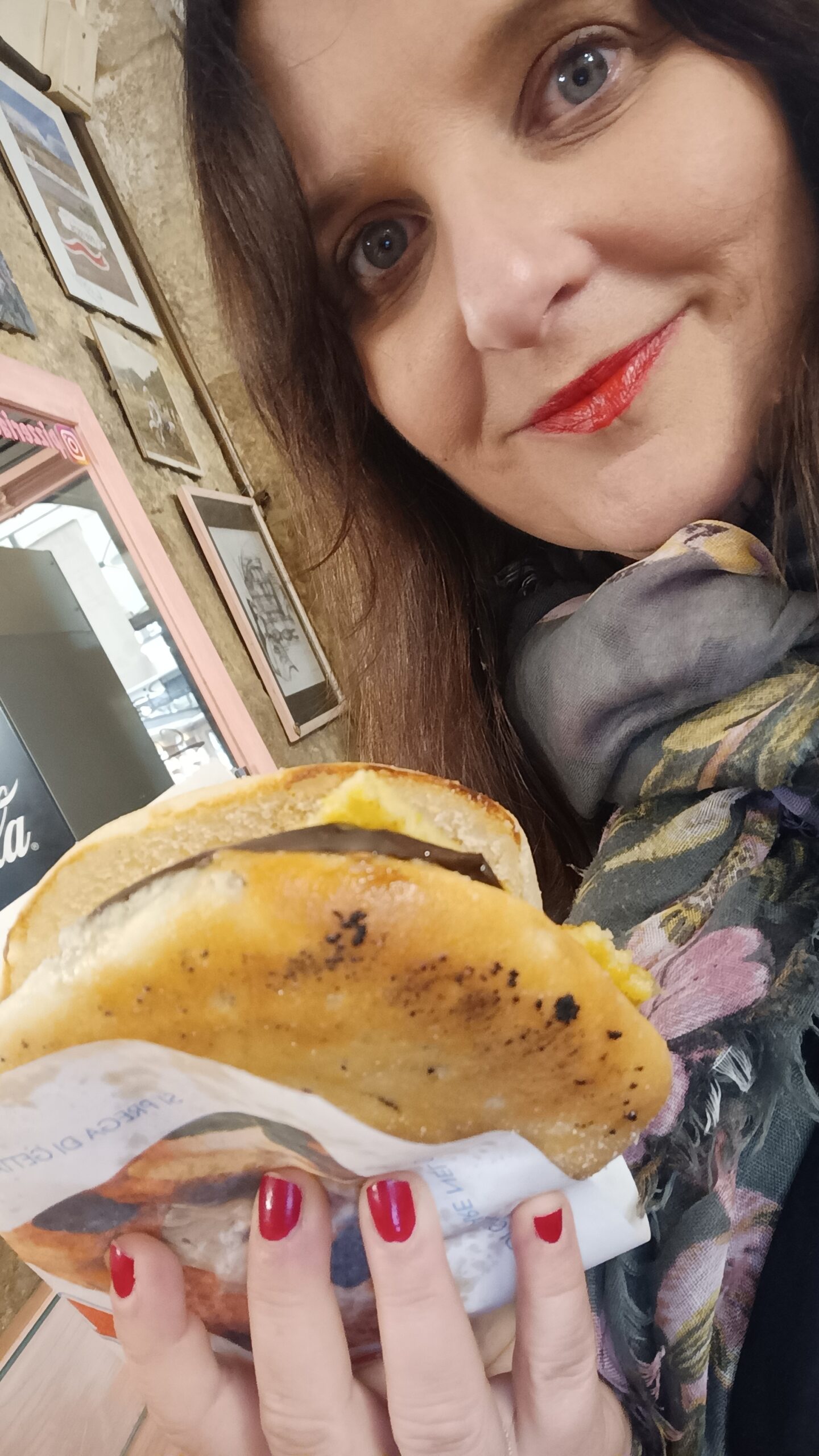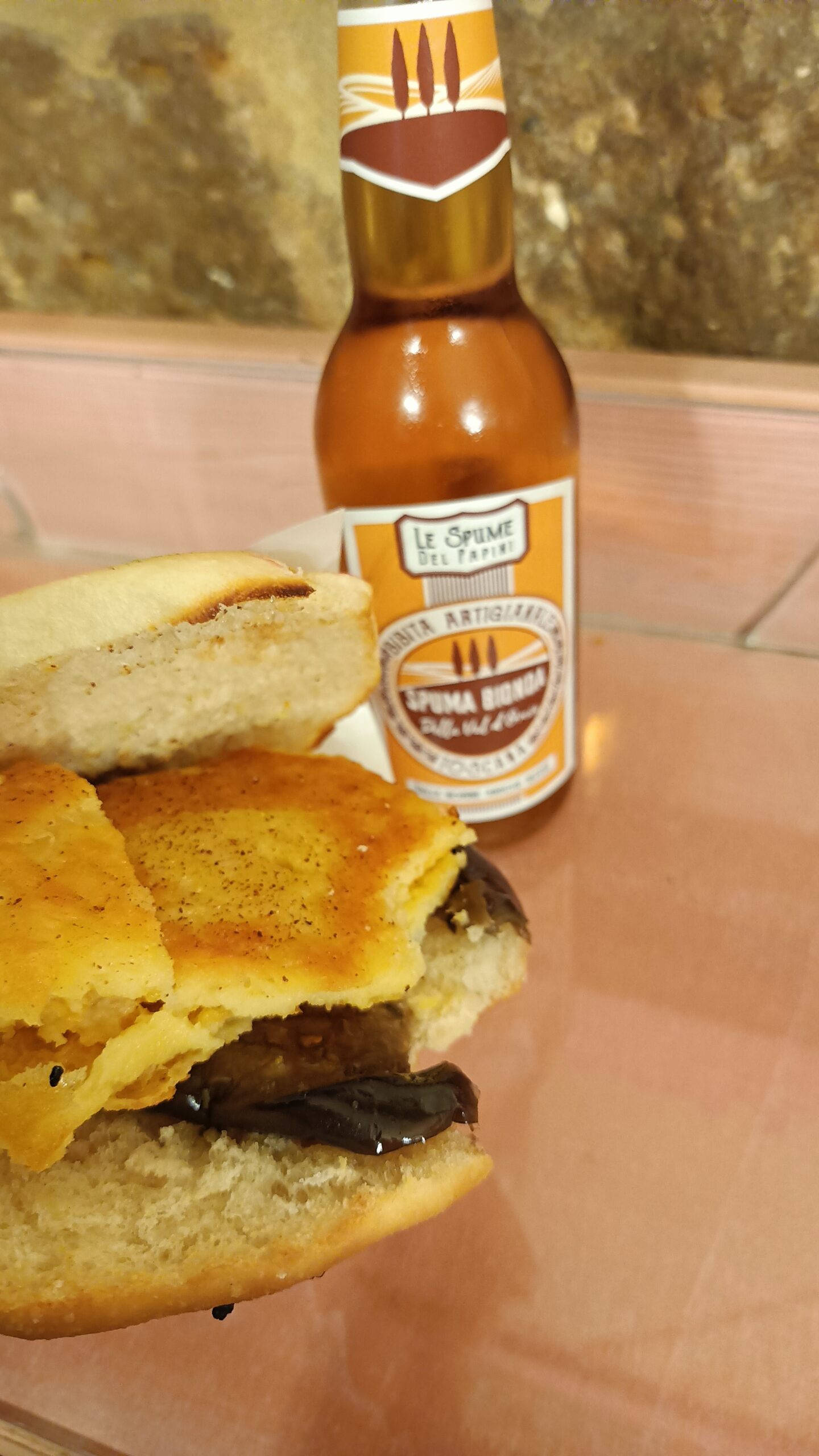 „5 e 5” było pyszne. Placek z ciecierzycy był miękki i rozpływał się w ustach. Sporo było go w środku kanapki. Natomiast plaster bakłażana był tylko jeden. Ja bym dorzuciła jeszcze jeden. Okrągła schiacciata sporych rozmiarów, cudownie zaspokoiła głód. Spytałam właściciela, czy do ciasta dodał semolę, bo było takie mięciutkie. Ale odpowiedział, że tylko używa tylko zwykłej białej mąki pszennej.