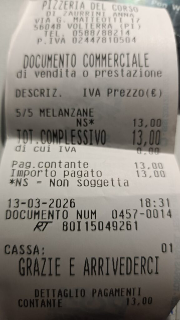Z wielką radością odkryłam, że również w Volterze można znaleźć „5 e 5”. Ktoś powie, że ta nazwa używana jest tylko w Livorno, ale jako dowód mogę pokazać rachunek z pizzerii.