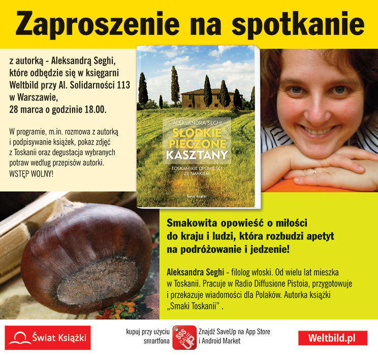 2 pazdziernika 2011 – Spotkanie z autorka ksiazki Aleksandra Seghi oraz autorka zdjec Magdalena Szwedkowicz-Kostrzewa odbedzie sie o godzinie 11.30 na Polach Mokotowskich, w Restauracji Merylin kolo jeziorka z fontanna. Dla czytelnikow Smakow Toskanii przewidziana mala degustacja wloskiej potrawy. Serdecznie zapraszamy!!